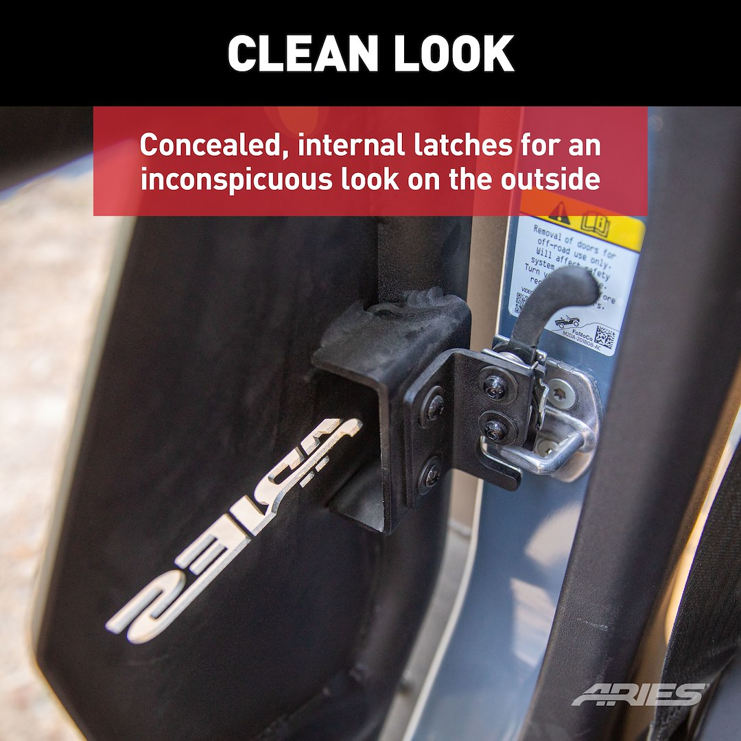 When traveling into the backcountry and far down off-road trails, nothing is more freeing than riding with open-air, safari-style doors on your Ford Bronco. ARIES tube doors provide a safer open-air riding experience that will transform your Bronco and provide improved sightlines when traveling down rocky trails that require visibility for navigation. ARIES tube doors are strong, lightweight and built with hardened T6 aluminum tubing, which provides rigid strength and long life. These tube doors are TIG welded for superior weld strength that prevents cracking for a long life that will withstand years of use. The black carbide power coat finish will prevent corrosion and its textured finish prevents scratches as you navigate into nature and down brushy, wooded trails. ARIES tube doors are designed to fit the factory door hinge points of your Ford Bronco for an easy, quick installation that requires no modifications, cutting or drilling to your truck. The low-profile tube doors work with OEM side-view mirrors and will not damage or scrape when opening or closing and features a latch mechanism on the inside of the door which provides a clean, inconspicuous look.