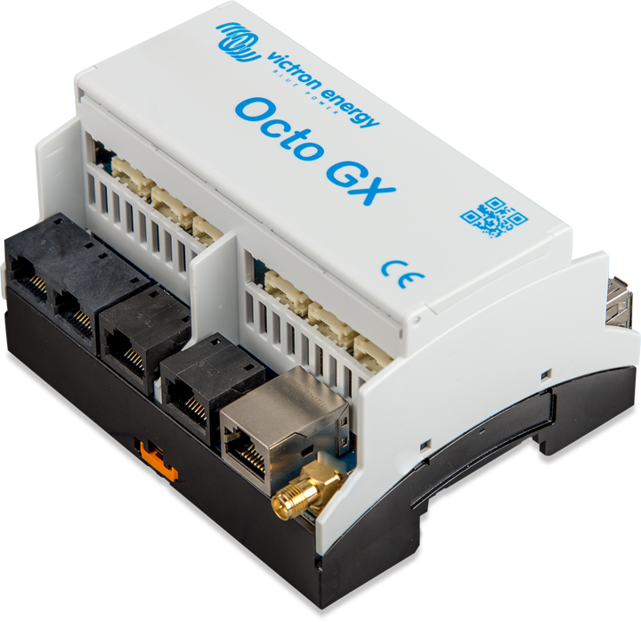 The Octo GX is a member of the GX Product Family. The Octo GX is the best fit for installations that have many MPPT Solar Chargers, as it has 10 VE.Direct ports. The Octo GX is the communication-center of your installation. It connects the components together and ensures they are working in harmony. Monitoring of live data, and changing settings is performed by using your smartphone (or other device) via our free-to-use Victron Remote Management Portal, VRM.