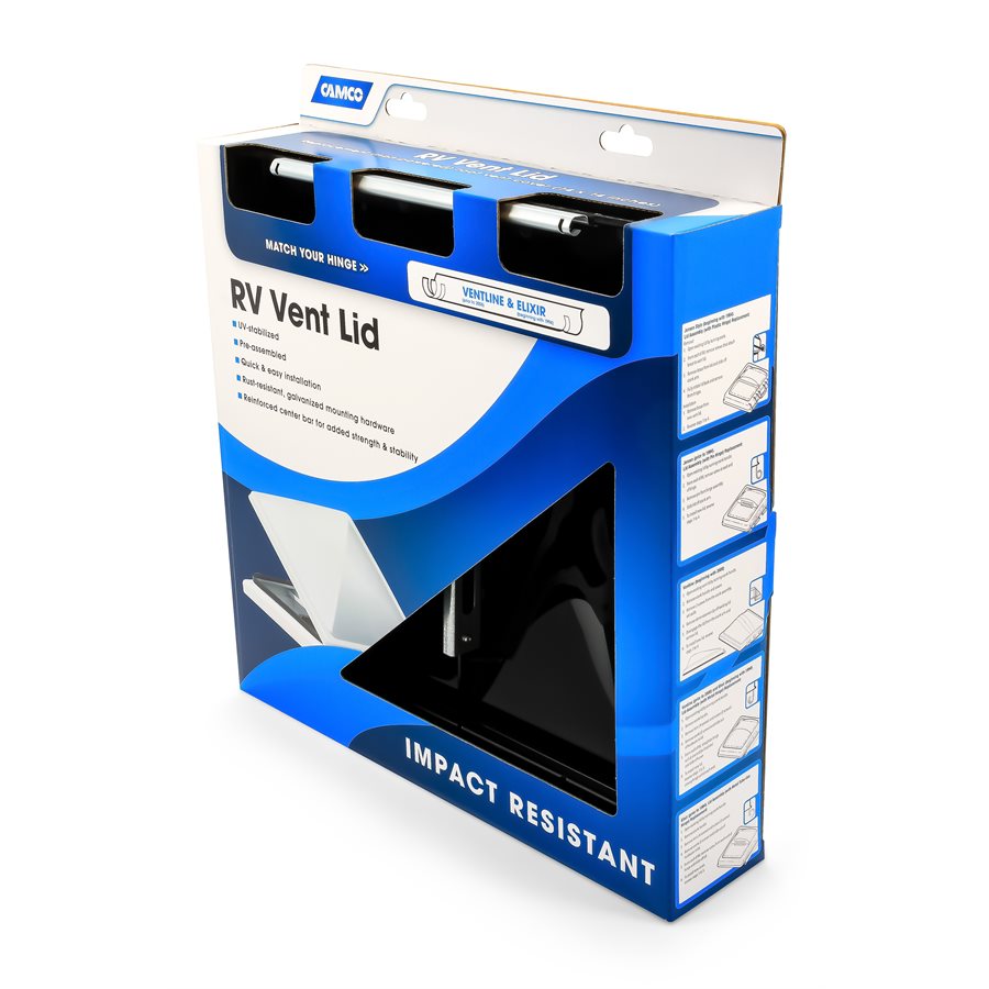 Camco's Black Polypropylene Replacement Vent Lid for New Jenson Metal Vent Lid, Jensen Metal Base for models '94 and up, is impact-resistant and comes preassembled. It Features all mounting hardware for quick, easy installation on all 14 Inch x 14 Inch RV vents. Hardware is rust resistant.