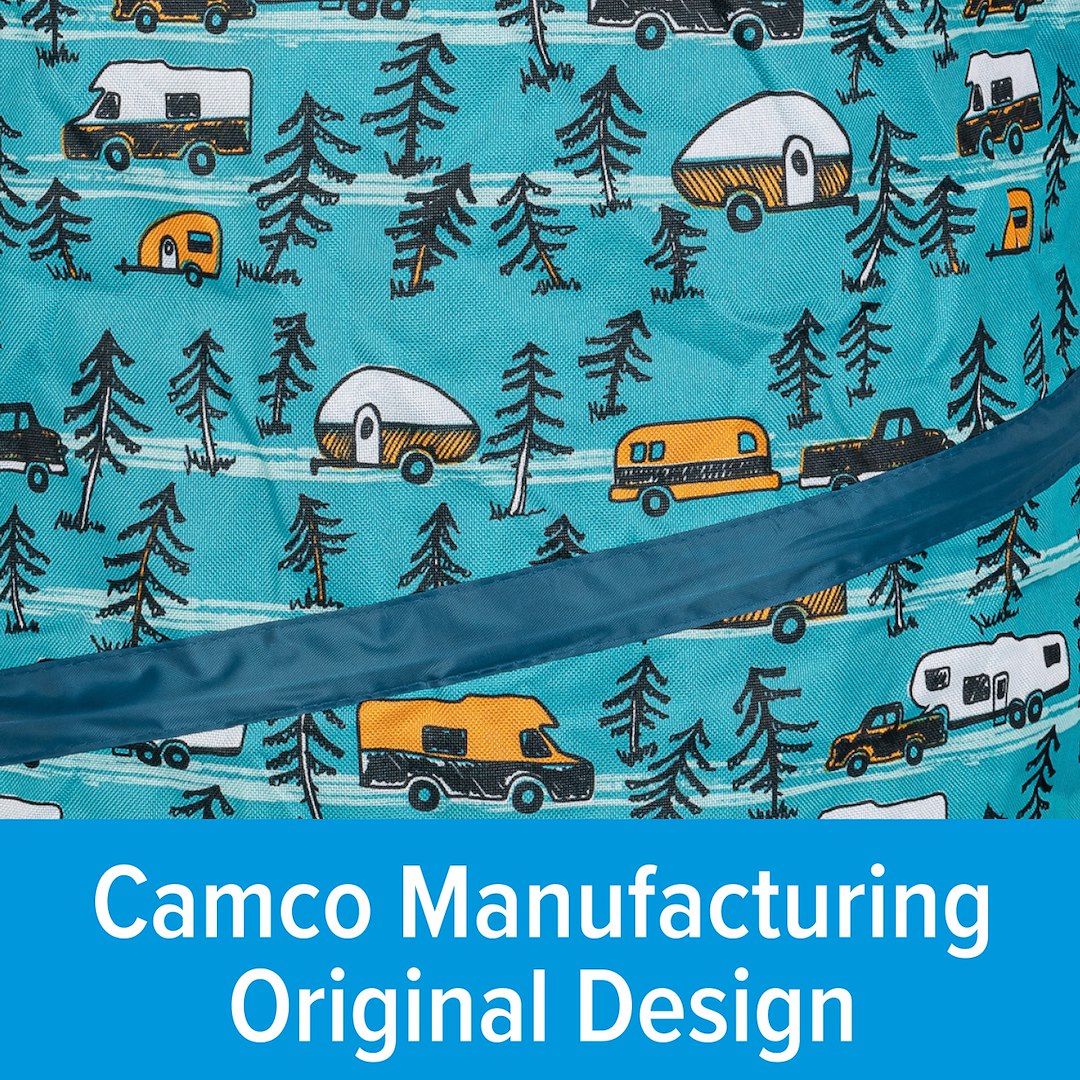 Life is Better at the Campsite Pop-Up Utility Container is great for camping, picnics, boating, tailgating, lawn and garden, and more. Its unique design features sketched RVs and trees over a teal-colored background perfect for RV enthusiasts. The utility container stores at just 2-1/2 Inch tall and expands to 24 Inch tall x 18 Inch diameter. This heavy-duty PVC container holds 30 Gallon trash bags and is tear resistant. Features a fully-zippered lid, padded handles and a durable liner; features a stake to anchor it to the ground and a reusable storage bag. Multi-Purpose: Great for camping, picnics, boating, tailgating, lawn and garden, and more Multi-Purpose: Great for camping, picnics, boating, tailgating, lawn and garden, and more Unique Design: Design features sketched RVs and trees over a teal-colored background Features: A fully-zippered lid, padded handles and durable liner features: A stake to anchor it to the ground and a reusable storage bag.