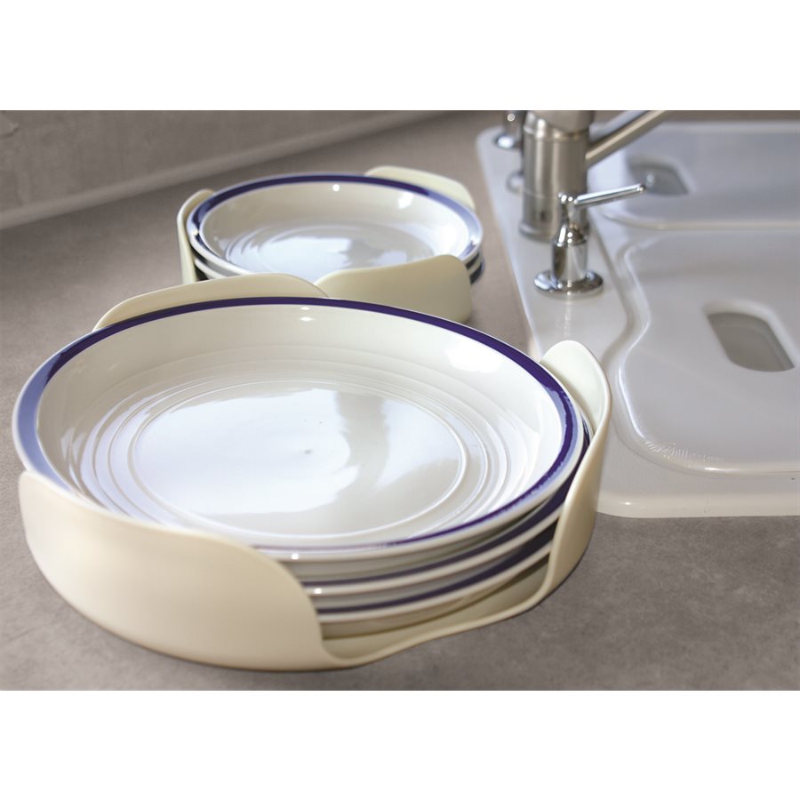 Stack-A-Plate™ with non-slip backing. Use in your cabinet to keep plates organized, and to stop them from sliding and rattling. Plates stay in place while traveling and are more protected from breakage. Set of two - one fits plates up to 7-1/4 Inch, the other fits plates up to 10-1/4 Inch. Bright white. Dishwasher safe.