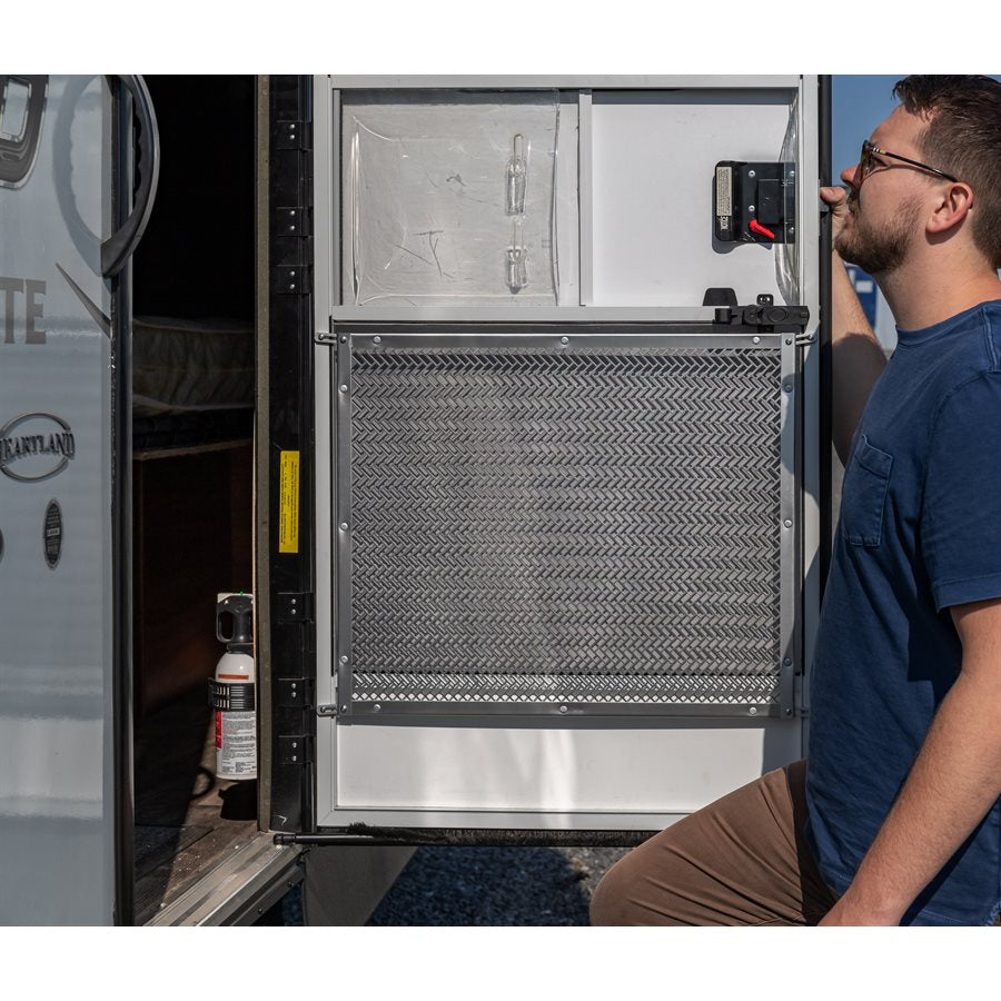 Camco's Premium Lower RV Screen Door Grille helps protect your RV screen door while adding a great, decorative look. It adds a sturdy feel to your RV door and saves repairs to screens. The grille helps prevent children and pets from pushing through the screen. This grille measures 24 1/4 Inch (L) x 20 1/4 Inch (W) and adjusts from 20 Inch to 29 Inch wide. Features all necessary hardware for easy installation.