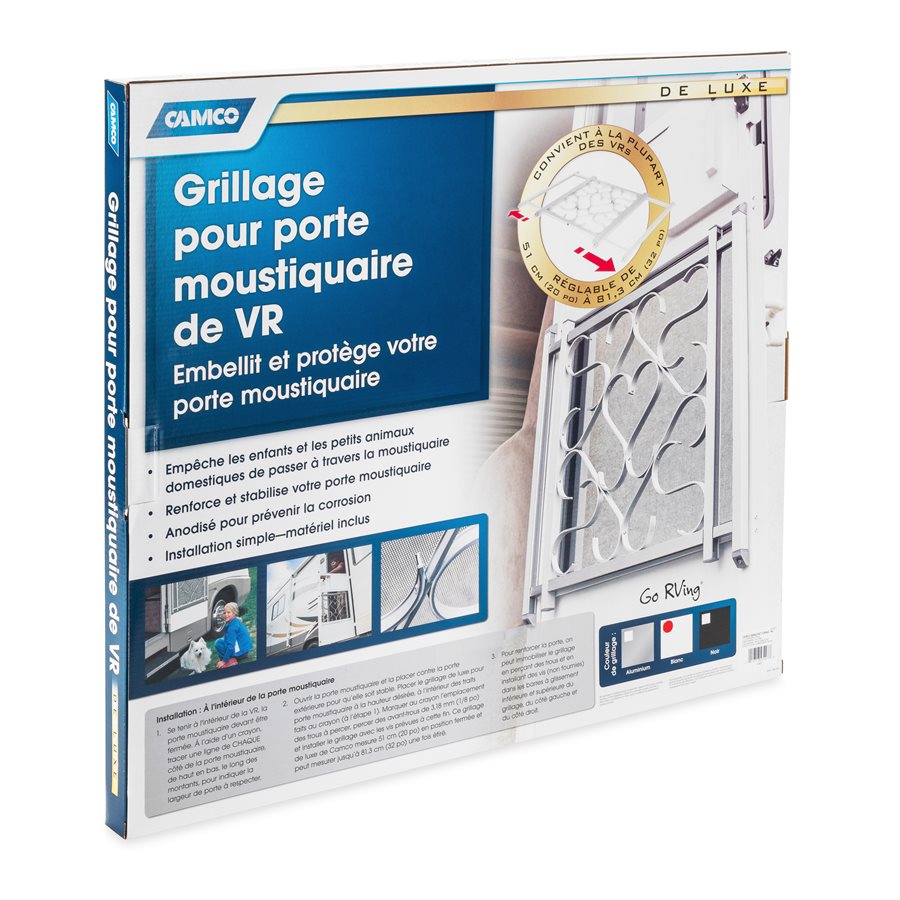 Sturdy Push Bar and Screen Door Grilles combine to allow for easier exit and protection of your RV screen door. Adds a sturdy feel to your door and saves repairs to screens. Helps prevent children and pets from falling through screen. Push Bar and Deluxe Grille both adjust from 20 Inch To 32 Inch; Standard Grille adjusts from 20 Inch To 29 Inch. Easy installation, hardware included