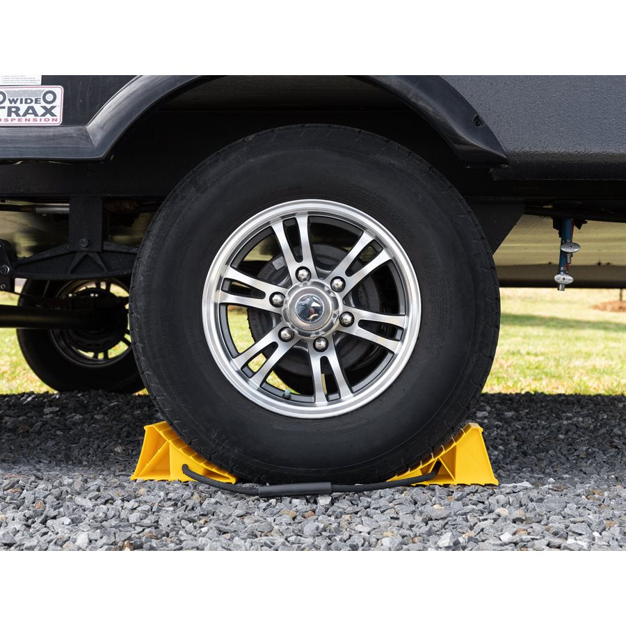 Camco's RV Double Wheel Chock with Rope is designed to keep your trailer in place while parked and allows you to re-hitch with confidence. (2) wheel chocks are connected by a rope with handle, to make removing the chocks from the wheel safe and easy, while providing simple carrying. This item has a durable polymer construction with UV inhibitors. Fits tires up to 26 Inch in diameter. Made in the USA.