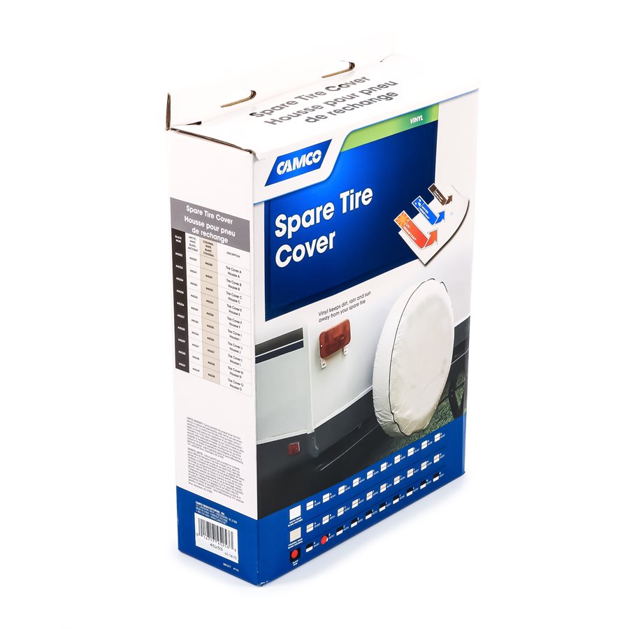 Camco 32-1/4 Inch Diameter Arctic White Vinyl RV Spare Tire Cover helps keep dirt, rain and sun away from spare tire. Heavy nylon thread helps ensure Weather Proofing of seams.