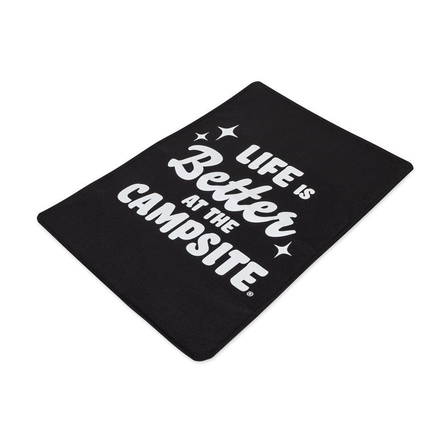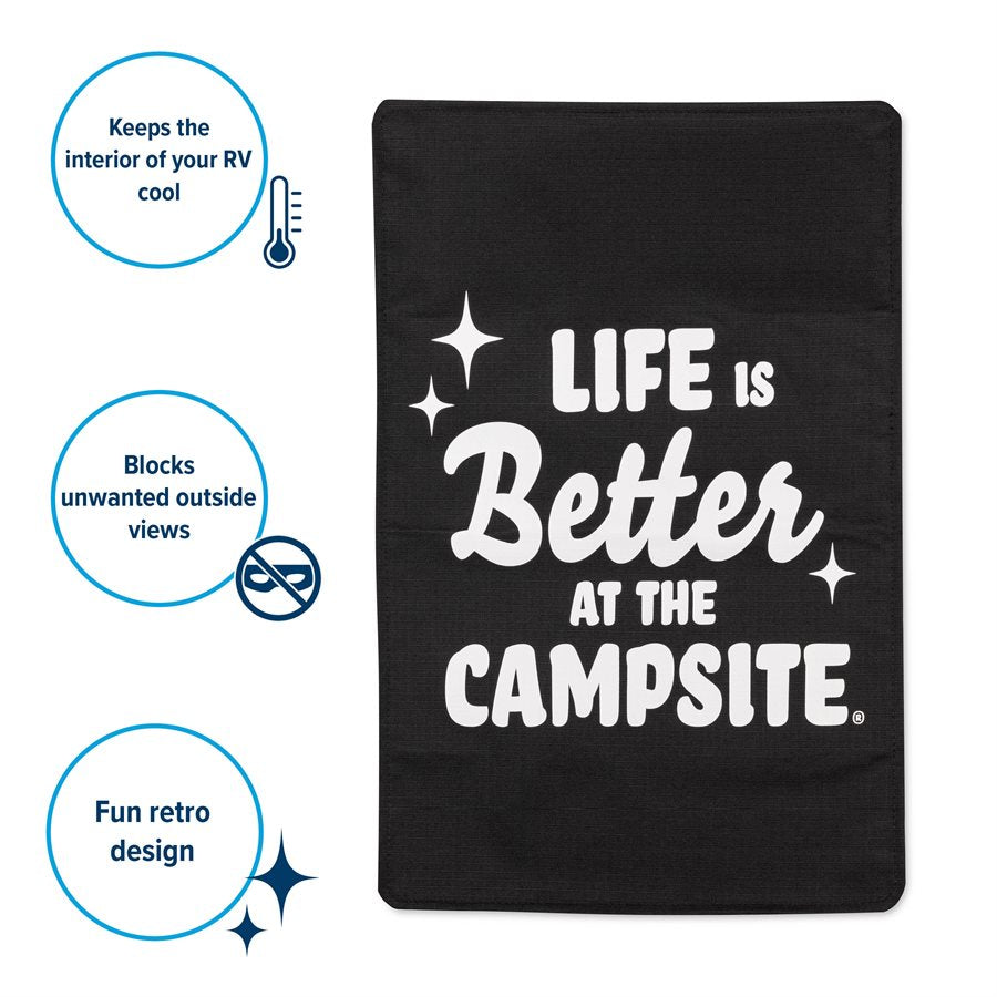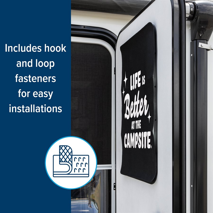 Camco's Life is Better at the Campsite RV Door Window Light Blocking Shade protects your RV interior from the sun and helps keep the interior temperature cooler in hot weather. This shade also provides additional privacy by blocking unwanted outside views. The fun design features large "Life is Better at the Campsite" text with retro stars. Product is made of black nylon ripstop with a silver reflective backing. Features hook and loop fasteners for easy installation.
