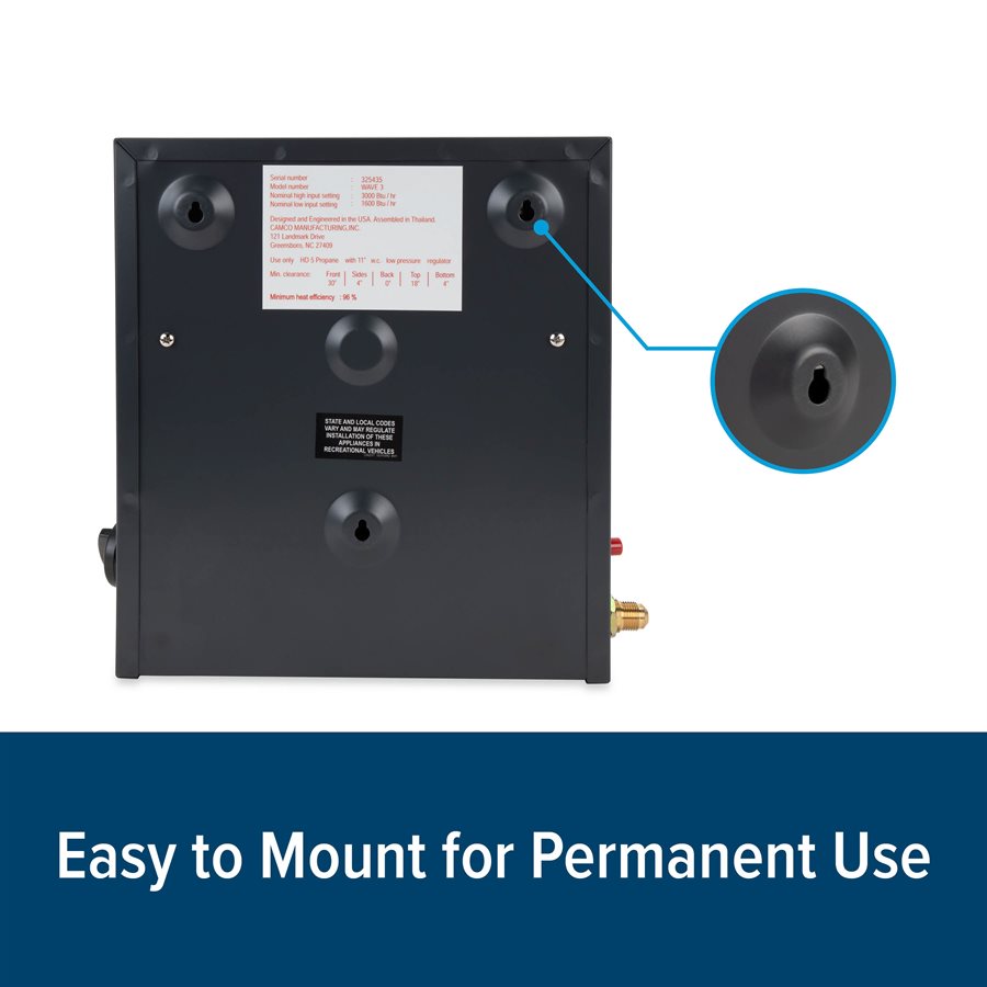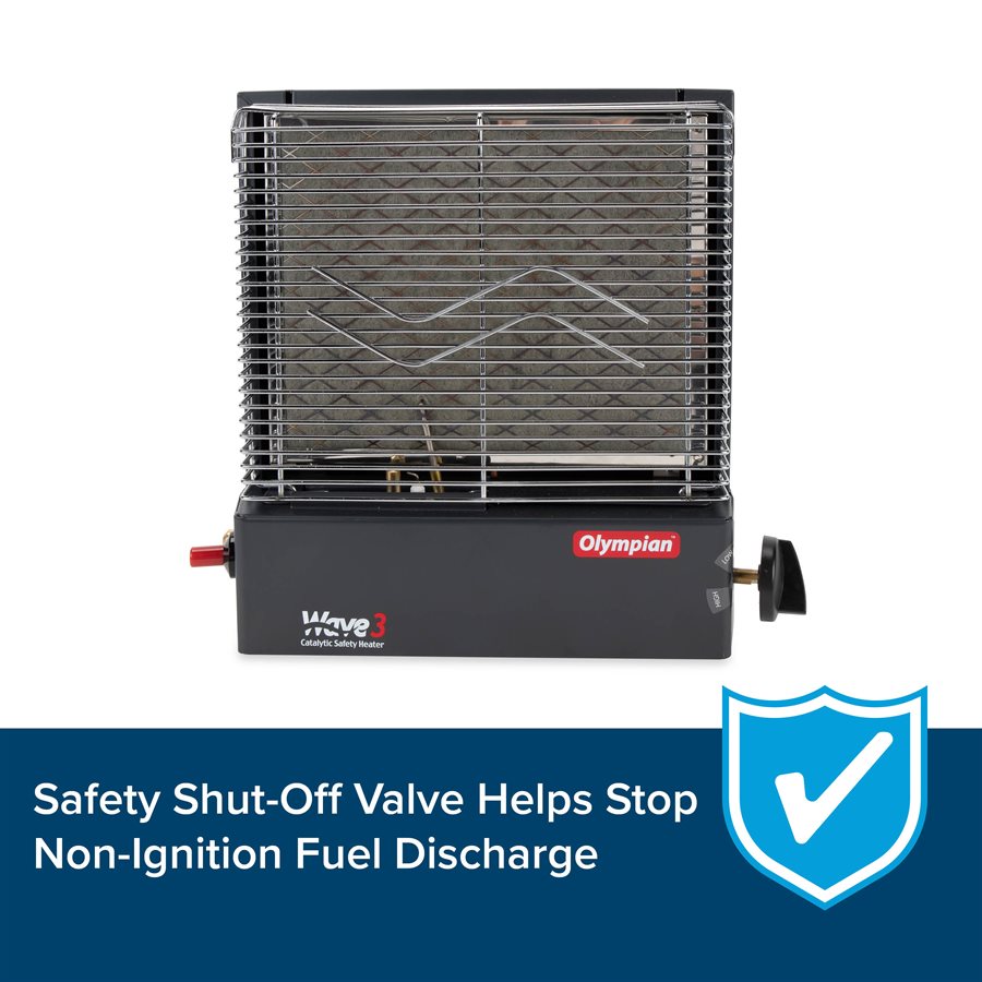 An ideal primary or secondary heating source. Wave™ heaters operate on low pressure LP gas, and can be wall mounted or used as portables. Equipped with an integral safety shut-off valve to help prevent accidental non-ignition fuel discharge. The built-in Piezo electric spark starter will last for 20,000 starts. No electrical drain or battery connection.