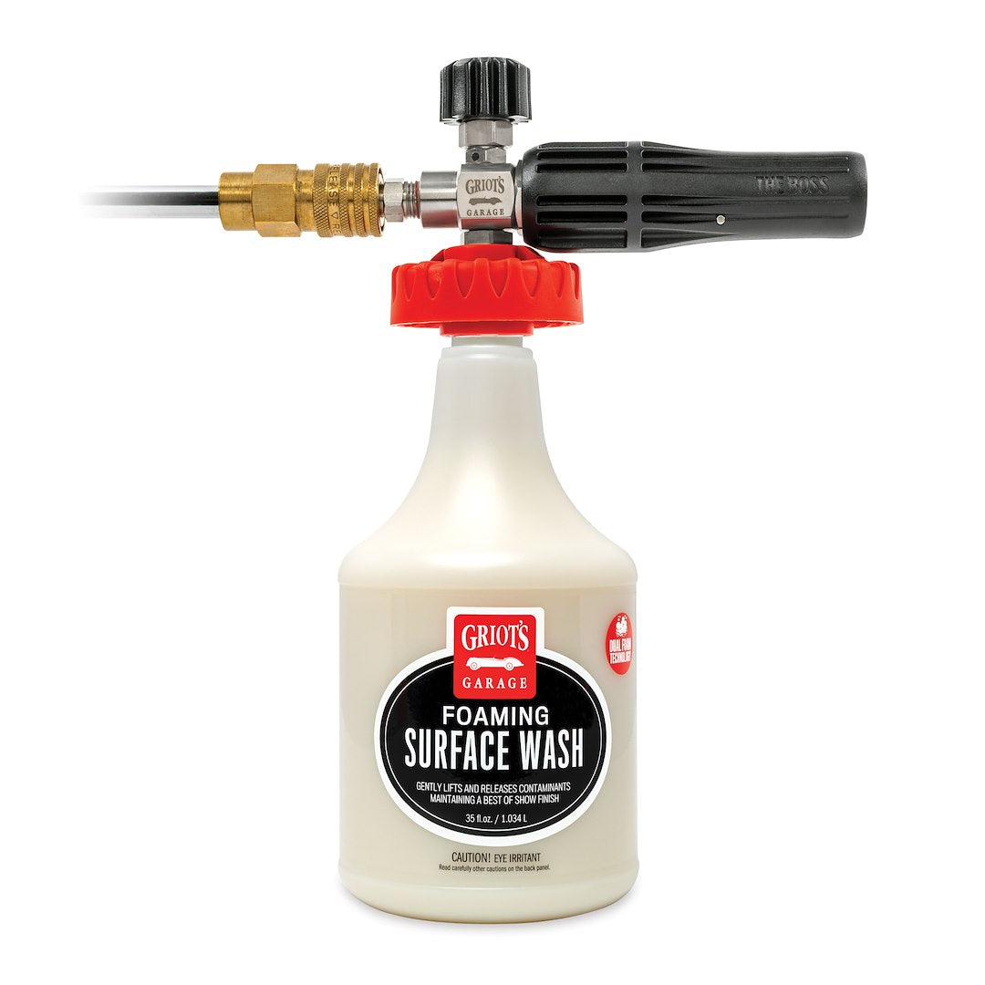 Meet the safest way to wash. We've worked the chemistry hard to make Foaming Surface Wash pH-neutral so it cleans softly and prolongs the life of your existing waxes and sealants. This is the foaming cleaner you should use for routine washing to maintain your Best Of Show finish. It can be utilized as a pre-wash or touchless wash. It's also a great way to increase the safety and fun of your weekly car washing therapy. Along with our exclusive dual-layer foam formulation, another advanced technology of our foaming products is their viscosity, which has been precisely calibrated to work with the BOSS Foam Cannon's exclusive Auto-Mix feature. This feature allows you to screw on a bottle of wash and spray away at the proper ratio.