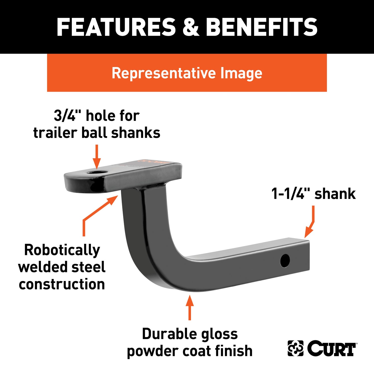 CURT class 1 ball mounts are designed for a variety of lightweight towing applications. For basic utility trailers, canoe haulers and other light-duty trailers, a class 1 ball mount gets the job done. CURT class 1 ball mounts are designed to complement our class 1 trailer hitches and come in several different styles, offering a range of shank lengths and drop and rise options. A class 1 ball mount is typically used on compact cars, full-size cars, minivans and crossover SUVs, but it can be used on virtually any trailer hitch with a 1-1/4 Inch x 1-1/4 Inch receiver tube (NOTE: Never exceed the lowest weight capacity of any towing component; i.e. the vehicle, hitch, trailer, etc.). This class 1 ball mount features a gross trailer weight capacity of 2,000 Pound and a tongue weight capacity of 200 Pound It has a length of 11-1/2 Inch and a rise of 3-3/4 Inch. CURT ball mounts, like our trailer hitches, are built to last. They are made from quality steel that is CNC-formed and robotically welded to be an exact fit for your receiver hitch. To protect our class 1 ball mounts from corrosion, UV damage and scratches, we coat each one in a powder coat of high-gloss black for a sharp finish.
