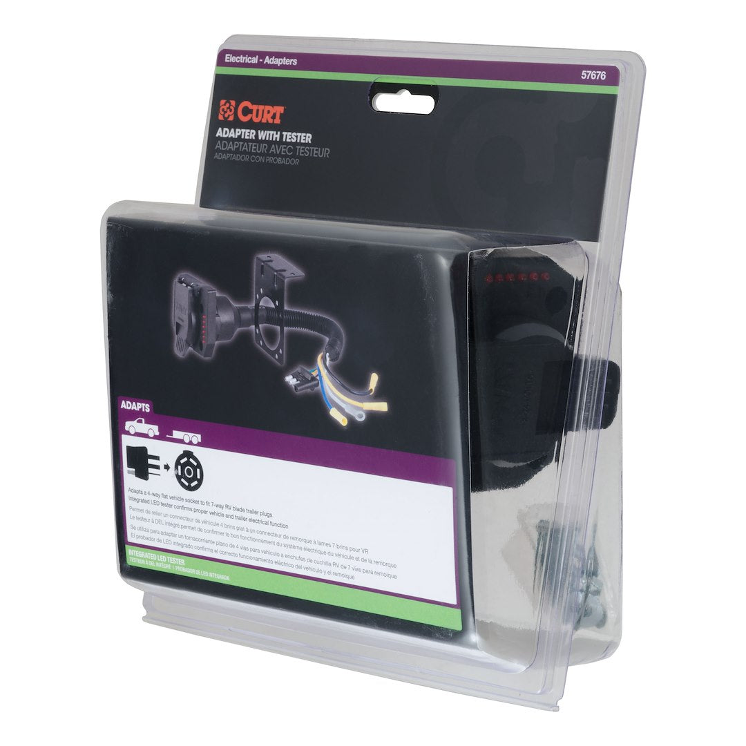 There are several different types of connectors used to supply power from a tow vehicle's electrical system to a trailer's wiring system. Some trailers only need the bare essentials -- running lights, brake lights and turn signals -- while others require a connection for reverse lights, electric brakes and auxiliary power. With connectors ranging from simple to complex, it may be the case that the connection between your vehicle and your trailer is not a perfect match. For example, your truck may be equipped with a 6-way round socket, but your trailer may have a 4-way flat plug. For this very common problem, CURT offers a quick and simple solution in the form of an electrical adapter. An adapter is an electrical device that allows a connection to be made between a mismatched trailer plug and vehicle socket. It easily plugs in your vehicle's electrical socket and usually requires no additional wiring. CURT offers an array of adapters to accommodate most types of plugs and sockets, including 4-way flat, 4-way round, 5-way flat, 6-way round, 7-way RV blades and more. This electrical adapter is designed to adapt a 4-way flat vehicle socket to fit a 7-way RV blade trailer plug. Some manual wiring is required.