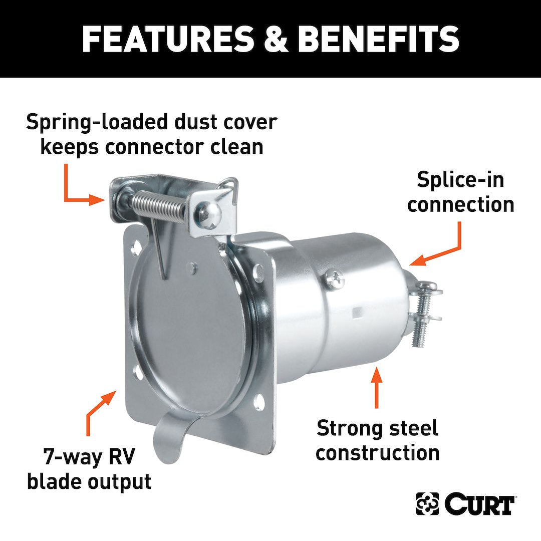 Like trailer hitches and ball mounts, electrical connectors range all over the board in shape, size and capability, but no matter what your trailer's electrical functions are, you need a solid connection to keep the power flowing and ensure safety on the road. CURT electrical connectors are designed and manufactured to give you a reliable connection every time you plug in your trailer. This 7-way round RV blade connector is designed to supply power for tail lights, turn signals, electric trailer brakes, a 12-volt battery, reverse lights and brake lights, as well as a ground connection. It features durable die-cast metal construction and comes with a spring-loaded cover to keep out dust and water. This 7-way round connector is a female-end socket, specifically designed for the vehicle side of the connection. 7-way RV blades are typically used on RV travel trailers, and this particular connector can be easily interchanges with other 7-way RV connectors.