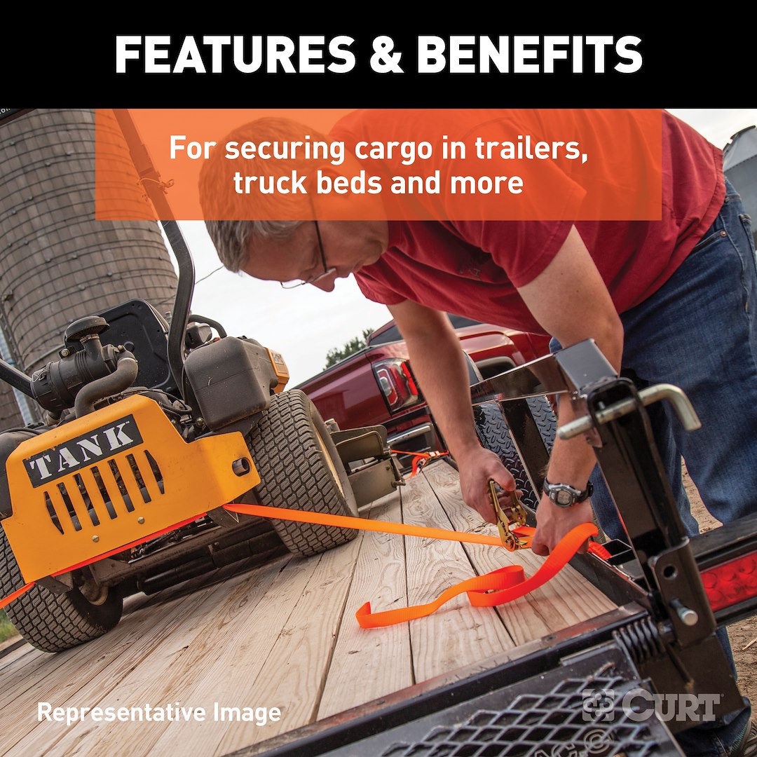 Wrapping rope around your trailer and hoping for the best is not the ideal way to secure cargo. Even using a net of bungee cords can create an unsafe scenario if just one of those bungees pops loose. Using the right method to secure your cargo is an important aspect of towing that is too often overlooked. When you need cargo security that can handle the long haul, you need CURT cargo straps. We offer two different types of cargo straps in a variety of colors, lengths and with various hook types to give you a complete towing solution. These CURT ratchet tie down straps are designed to accommodate larger, heavier loads. They are made from a high-strength, woven nylon material and come with a ratcheting buckle that allows for superior tension on the load. They feature a break strength of 1,500 Pounds and a work load limit of 500 Pounds. These red cargo straps come equipped with rubber-coated S-hooks for a secure hold and strong resistance to corrosion and wear. They measure a total length of 16 Inch and have a strap width of 1 Inch.