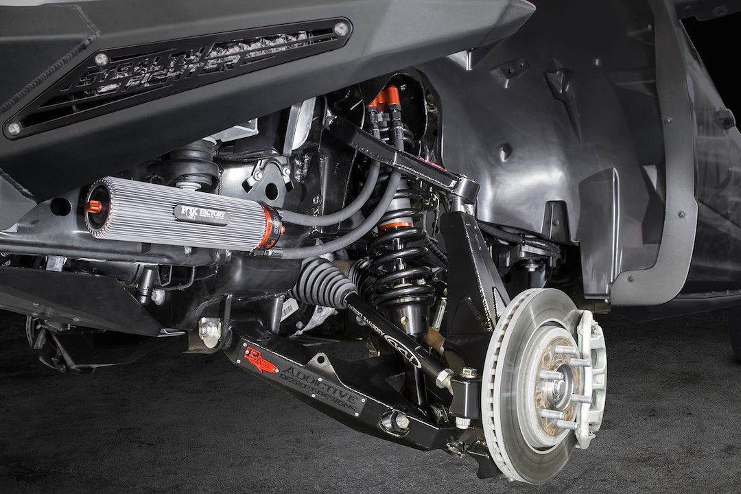 The Addictive Desert Design's Ford Raptor Stock Replacement Spindle will work with both stock and replacement upper control arms, lower control arms, tie-rod ends, and brake kits. This spindle is a direct replacement with strength engineered into all of the right places. One of the features this spindle offers is the integrated progressive turn stop which ensures matched factory turning radius without having to limit or modify any of the stock components to operate safely. This spindle has been rigorously evaluated and cycled in Solid works and real world tested, ensuring smooth operation, optimal strength, as well as eliminating any possibility of crashing between components. In addition our upper and lower mounts are machined out of 4130 Chromalloy providing optimal strength and long term durability over the stock part. The spindle also boasts a heavy duty double shear tie rod mount, which is designed to work with our billet aluminum tie rod upgrade kit, and results in a much better integration between components, reducing slack and bump steer under extreme conditions.