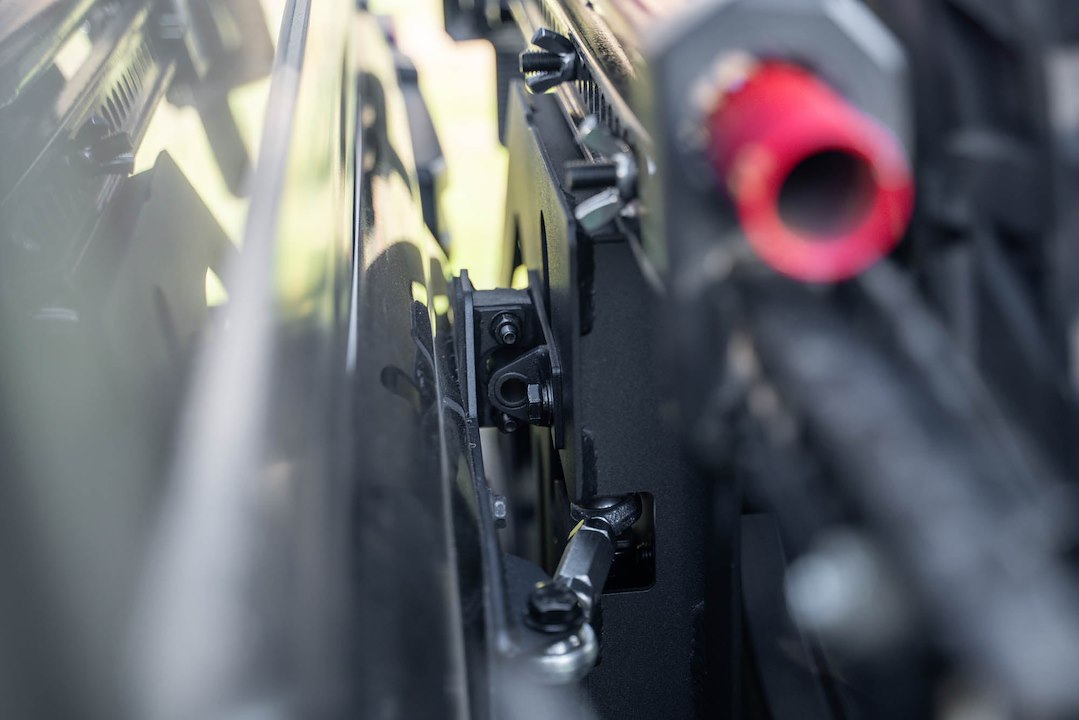 Wrangler JK Bumper Mounted Spare Tire Carrier was designed exclusively for use with our RBJK-13 Wrangler JK MTO Rear Bumper. The carrier swings out with the tailgate to provide ample access to the cargo area. A dual taper bearing and dual heim hinge pivot provides for easy and smooth operation of the carrier. By moving your spare tire off of the tailgate you protect it from flexing and movement when driving off-road. The carrier fits up to a 38x13-1/2 inch tire, and up to 20-Inch wheels (no wider than 9-1/2 Inch). Incorporated in the design is a built in hi-lift jack mount to fit securely between the tire and the tailgate. Finished in a micro-texture black powder coat, it also features a paintable aluminum logo plate that can be color matched to your vehicle.
