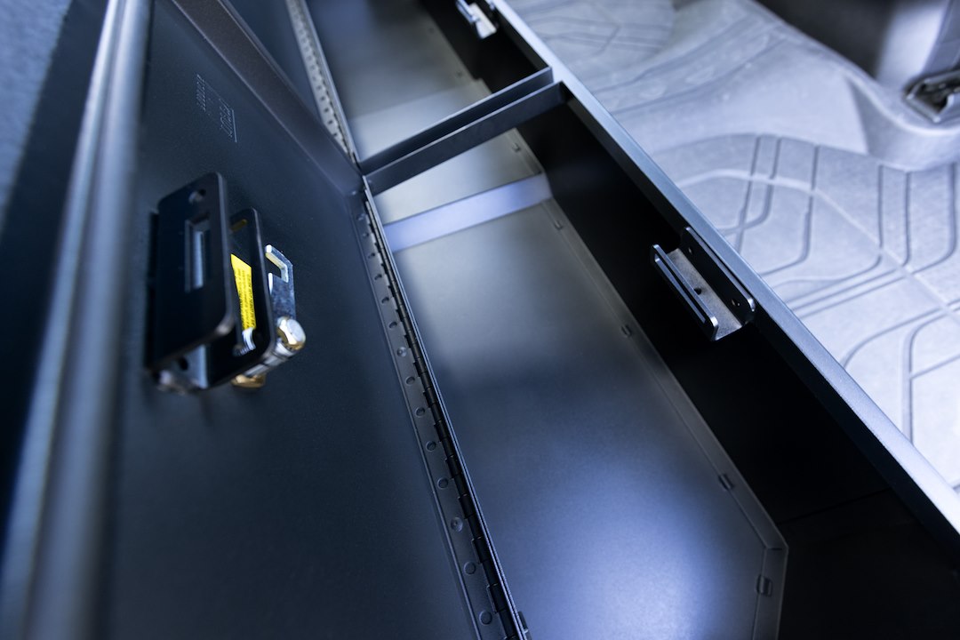 The Tuffy lockbox mounts under the rear seat in the GM Crew Cab and Double Cab pickup trucks. This high security 16 gauge steel security lockbox has a full width formfitting design creating over 3500 Cubic Inches of lockable storage. Easily access your secured contents by flipping up the corresponding lid under your 60 or 40 split bench seat. The unique design allows the full width to be used to stow firearms or other long items. Mounts inconspicuously under the seat out of sight of would be thieves with chamfered corners for easier passenger access. Declutter your space by quickly and easily installing this Tuffy lockbox using the factory hardware without drilling. When you need additional floor space, simply remove the lockbox in seconds without the need for any tools. The innovative mounting system can only be accessed from inside the lockbox.