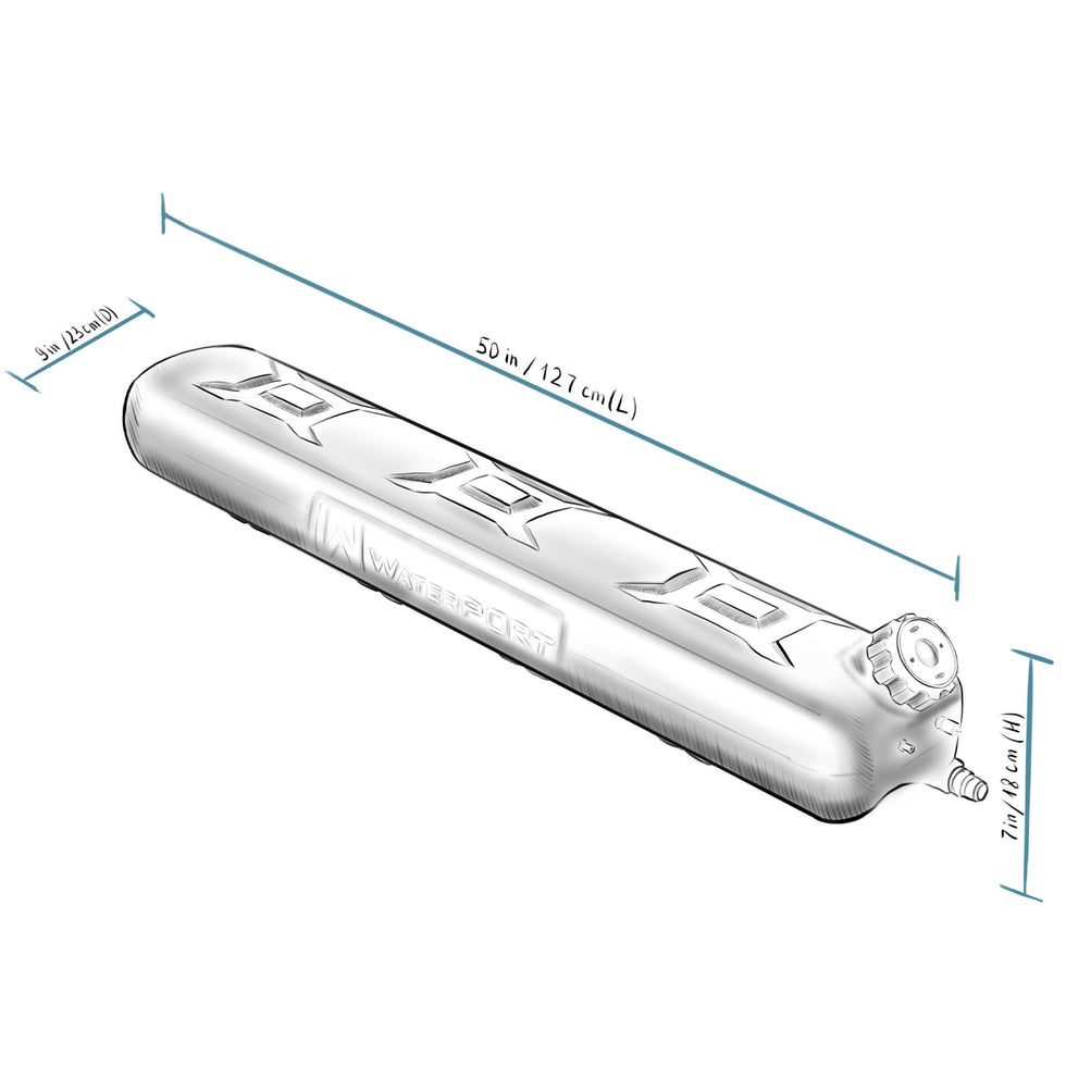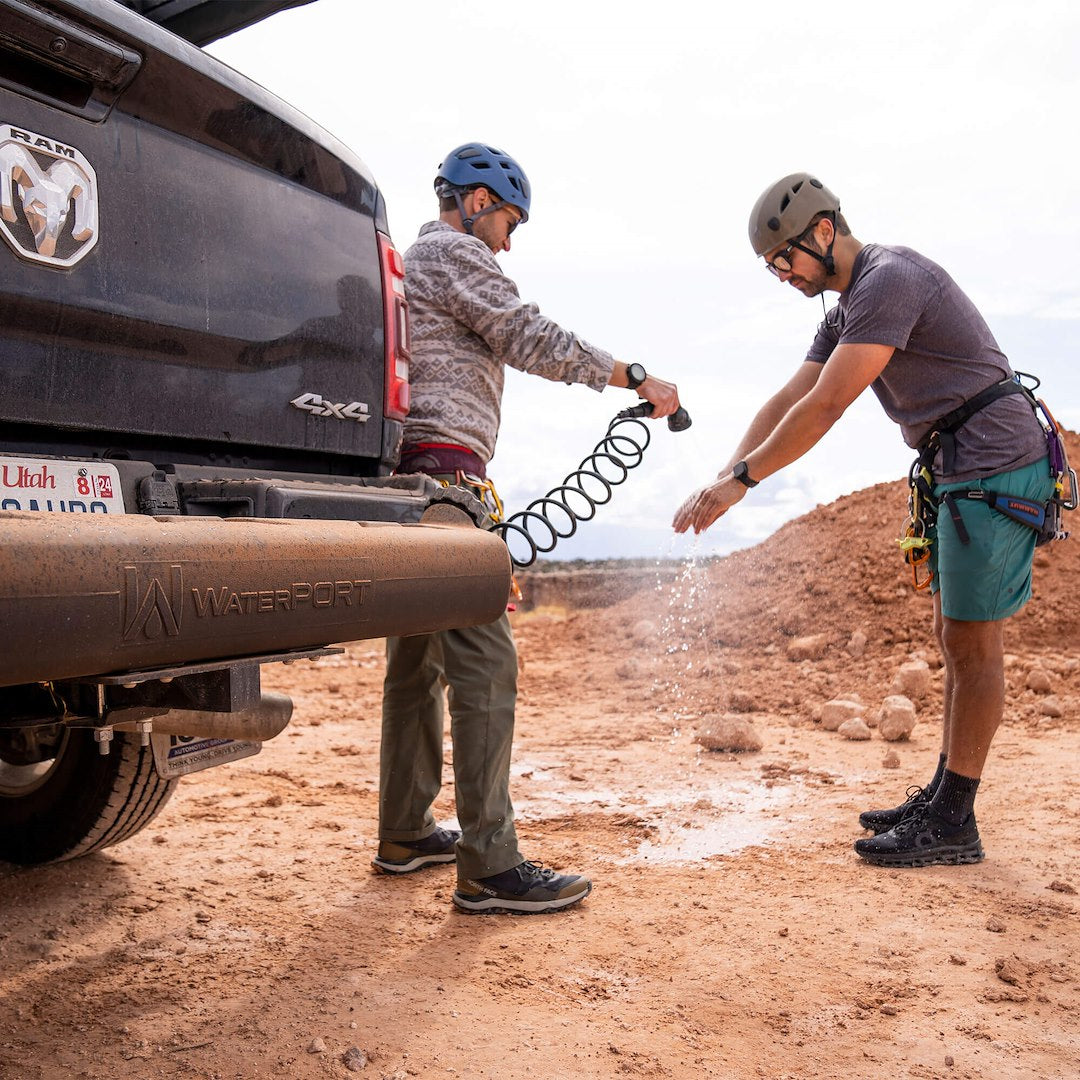 The Weekender comes with mounts for your roof rack and will work with platform or cross bar style racks (with additional hardware). Both the tank and hose are made from food-grade plastics and are safe for drinking water. Pressurize this tank using the included fill valve and your standard garden hose, or use the schraeder valve with your pump or compressor.