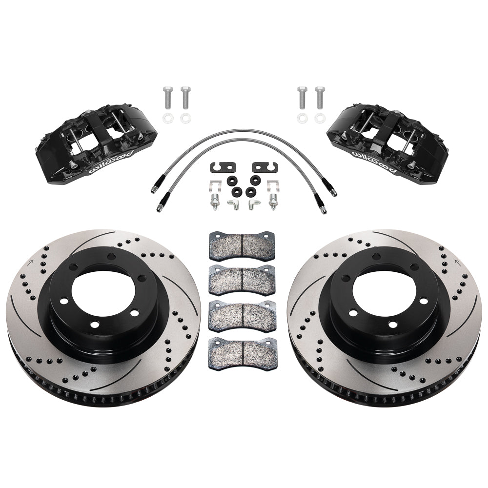 The Aero6-DM Direct-Mount Brake Kits provide better holding power while crawling and more thermal capacity for high-demand off-road and highway use, including towing, hauling, and commercial applications. They are engineered for direct mounting on Chevy, Ford, Jeep, and Toyota trucks, SUVs, and 4x4s. Forged aluminum Aero6-DM six piston calipers deliver increased clamping force and are compatible with OEM rear brakes, master cylinder, and onboard computer systems. 13.38 Inch x 1-1/4 Inch premium grade, long-grain carbon iron alloy rotors substantially increase braking performance with fade-resistant Wilwood performance brake pads. Kits fit in most 17 Inch and larger wheels.