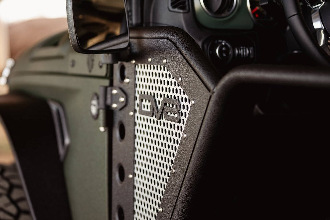 The DV8 Offroad JL Rock Doors provide protection and security while still allowing for an open air doorless experience. These rock doors come with a removable and paintable aluminum mesh screen and are made of .160 wall tubing and 3/16 Inch steel plating.