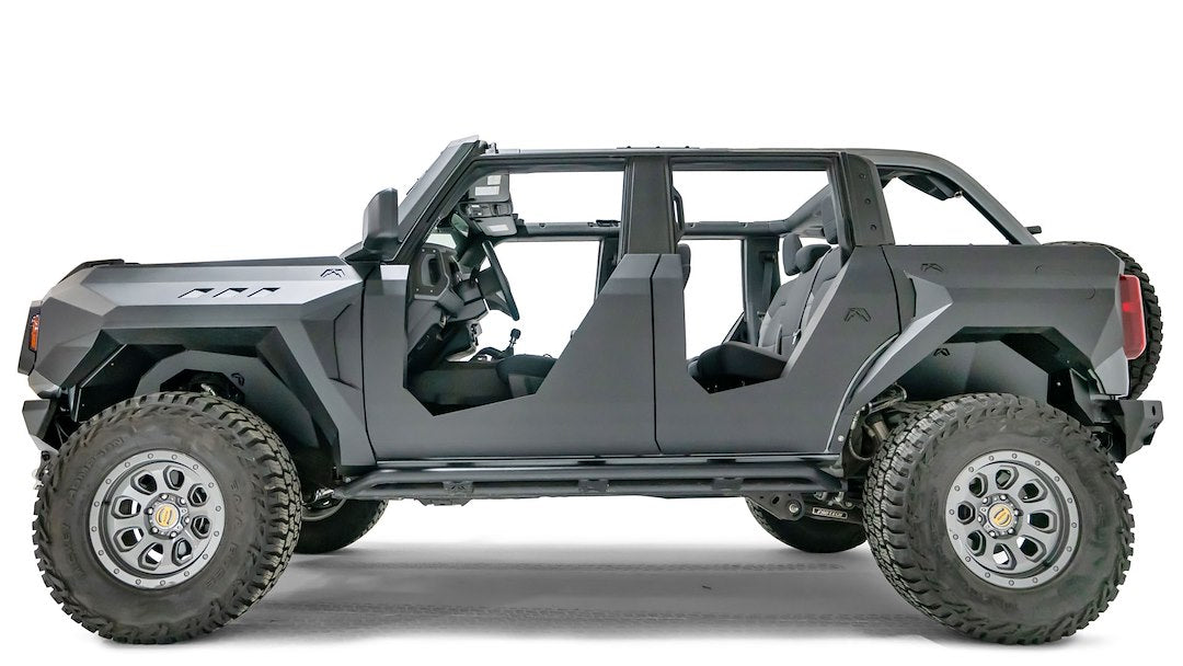 Game Changer: These are the all-new Ford Bronco Front and Rear Full Fenders by Fab Fours’! Elevating the look and style of your Ford Bronco. These fenders allow you to run up to a 35 Inch tire, front fenders (1) mounting point for a rock-light, front fender vents for added aggressive style, rear fender fuel door replacement w/ magnetic touch latch. Constructed out of 12 gauge US steel and ready to take on whatever you throw at it. Fab Fours – Made in the USA.