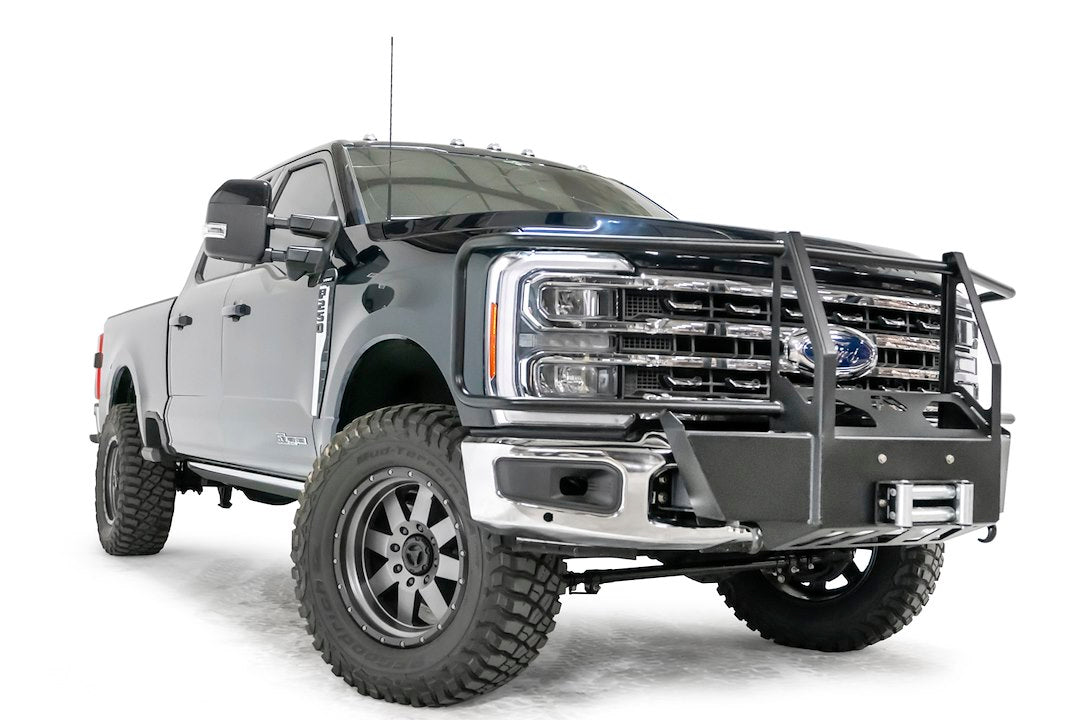 Introducing the Fab Fours Full Guard Winch Mount, a one-piece fully welded bumper designed for hardworking truck owners in search of uncompromising strength and functionality. Crafted with precision in the USA, this remarkable bumper combines robust construction with innovative design to tackle tough challenges with ease. The Full Guard Winch Mount is easy to install, slipping through the factory tow hook slots straight to the frame. Built to withstand the demands of work or off-road adventures, the Fab Fours Full Guard Winch Mount offers exceptional protection, functionality and ease of installation.