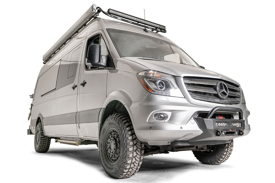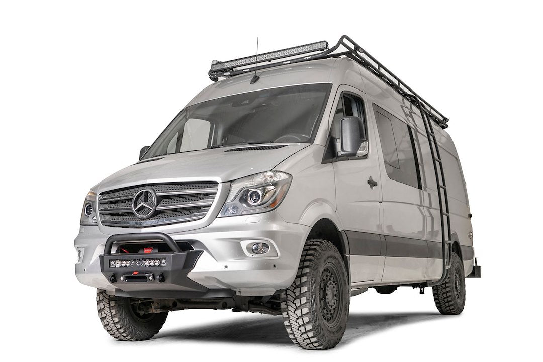 The perfect combination of form and function. The Fab Fours’ Semi Hidden Winch Mount for the 2017+ Mercedes Sprinter Van was made for the ultimate adventurous spirit. Key features include: winch-ready design; integrated d-ring mounts, integrated 20 Inch LED light bar housing. Will work with vehicle sensors with the purchase of sensor plate ( #M6750). Available in a no guard, pre-runner guard option. Always Made in the USA.