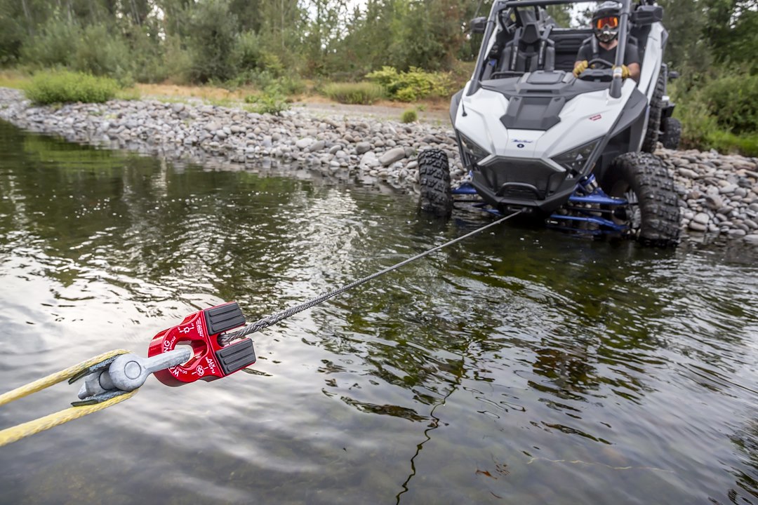 The FlatLink XTV allows UTV and ATV winch owners to replace the conventional winch hook with a safer and stronger shackle and D-Ring. Winch hooks can cut and fray recovery straps and often allow strap ends to escape during typical loose and tight cycles of a winching recovery. Screw pin shackles do not allow strap loops to escape due to the secure screw pin attachment. The FlatLink XTV does not require splicing and is compatible with steel cables or synthetic ropes up to 5/16 inches. The cable eye is retained in the FlatLink XTV by a 7/16 Inch diameter titanium double shear pin and internal snap ring. It is easily installed in minutes. The EPDM Rubber Guards protects alloy fairleads and is securely attached to the FlatLink XTV with 4 barbed tips. The FlatLink XTV stows neatly against either roller or Hawse type fairleads and is designed to be used with common standard 1/2 to 5/8 inch shackles. The FlatLink XTV is constructed of 6000 series billet aluminum and 6Al-4V titanium and is anodized and powder coated in 5 different colors. The FlatLink XTV has a max load rating of 8000 pound and an ultimate failure of 28,000+ pound.