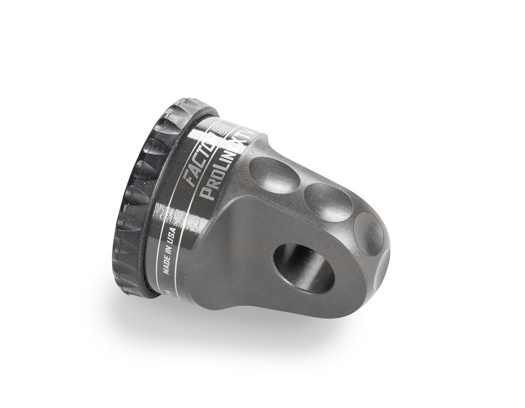 The ProLink XTV allows UTV and ATV winch owners to replace the conventional winch hook with a safer and stronger shackle/D-Ring. Winch hooks can cut and fray recovery straps and often allow strap ends to escape during typical loose/tight cycles of a winching recovery. Screw pin shackles do not allow strap loops to escape due to the secure screw pin attachment. The ProLink XTV does not require splicing and is compatible with steel cables or synthetic ropes up to 5/16 Inch. The cable eye is retained in the ProLink XTV by a 7/16 Inch diameter titanium double shear pin and internal snap ring. It is easily installed in minutes. The EPDM Rubber Guard protects alloy fairleads and is securely attached to the ProLink XTV with 4 barbed tips. The ProLink XTV stows neatly against either roller or Hawse type fairleads and is designed to be used with common standard 1/2 and 5/8 Inch shackles. The ProLink XTV is constructed of 6000 series billet aluminum and 6Al-4V titanium and is anodized/powder coated in 5 different colors. The ProLink has a maximum load rating of 6000 Pounds and an ultimate failure of 22,000 Pounds.