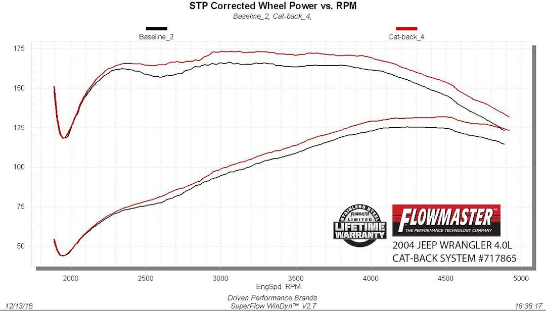 This FlowFX cat-back exhaust system is designed for 2000 to 2006 Jeep Wrangler TJ with 4.0 Liter engine and features all stainless steel construction for added durability and longevity. The 2.50-Inch FlowFX "straight-through" performance muffler mounts high in the frame rail just behind the factory catalytic converter and bolts up to the factory flange. The FlowFX system has a moderate deep powerful sound outside with minimal interior resonance. The 2.50-Inch mandrel-bent stainless steel tailpipe is tucked up high in the undercarriage protecting it from being crushed when traversing rocky terrain. The system is finished off with a large 3.50-Inch black ceramic coated stainless steel tip embossed with the Flowmaster logo. Uses the factory hanger locations.