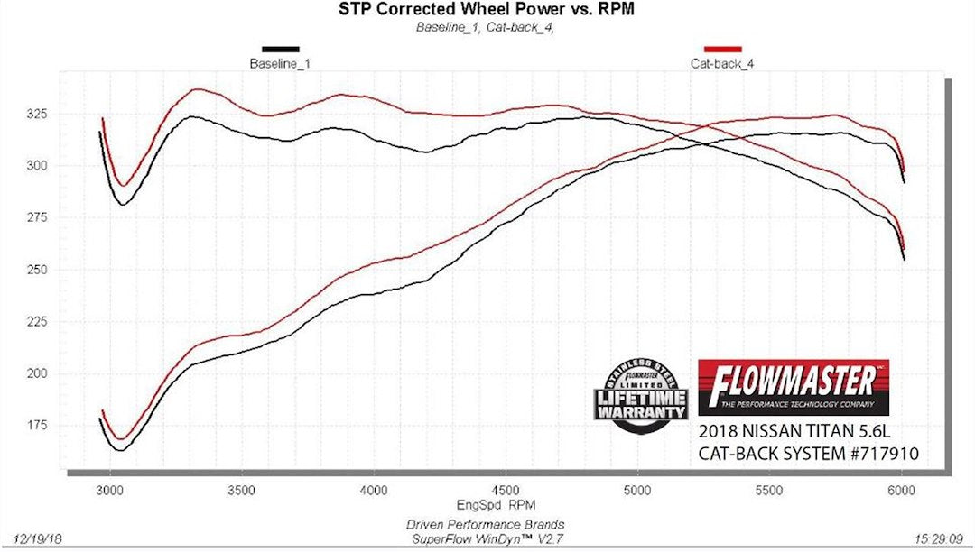 Introducing the new FlowFX Cat-back exhaust system for the 2017 to 2019 Nissan Titan with the 5.6 Liter engine. This performance exhaust system bolts up to the factory cat pipes with large dual 2.5-Inch mandrel bent tubing flowing into a Scavenger Y-pipe for maximum flow. The Scavenger Y-pipe creates a stronger signal than conventional y-pipes, by using two D-shaped ports back to back, giving a larger surface area than just two round pipes joined together. This creates a much stronger scavenging affect to help evacuate the cylinders during the exhaust stroke netting more power and torque. This is especially important for towing. The system flows out of the Scavenger collector into 3-Inch stainless steel tubing and into the "straight-through" FlowFX muffler that has a very deep powerful sound outside the vehicle with moderate tone inside the cab. The mandrel bent tailpipe exits behind the passenger side rear tire and is finished off with a large 4.50-Inch black ceramic coated exhaust tip embossed with the Flowmaster name. The system utilizes the factory hanger locations and connections.
