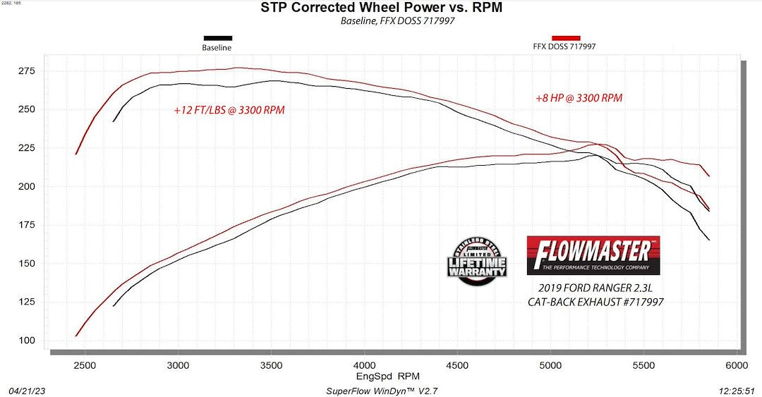 This Flowmaster® FlowFX® cat-back exhaust system for the 2019 to 2023 Ford Ranger with the 2.3- Liter engine is manufactured using durable 409 stainless steel throughout and features 3 to dual 2-1/2 Inch mandrel bent pipes for better exhaust gas flow. This system exits with dual 3-1/2 Inch black stainless steel tips for added style and a custom look. Max gains of 8 Horsepower and 12 Pound-Feet of torque at the rear wheels over stock. The system uses all the existing factory hanger locations and features installation instructions and all necessary hardware for an easy installation that you can do at home.