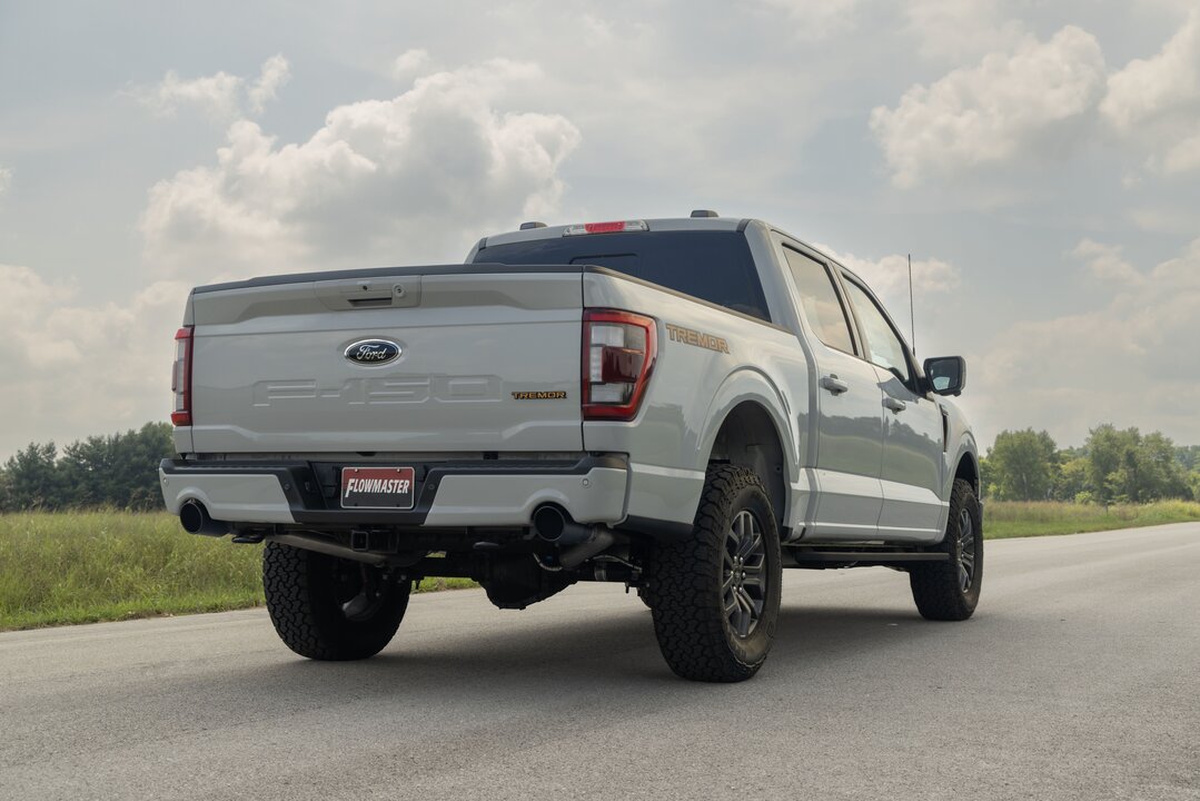 This exhaust offers a deep throaty exhaust note with aggressive to moderate sound levels both inside and outside of the truck, with all the performance benefits that you would expect from Flowmaster. This bolt-on emissions-legal system features all mandrel-bent 409 stainless steel 3 Inch tubing that flows into a FFX straight through muffler and exiting into large 3 Inch dual tailpipes for maximum sound and performance. The system exits the OEM rear bumper cut outs and uses all the factory hanger locations. The tailpipes are finished off with a pair of large 4-1/2 Inch black ceramic-coated stainless-steel tips for a more aggressive look than the factory tip. Designed for an easy fit, this system features all necessary parts and hardware for installation.