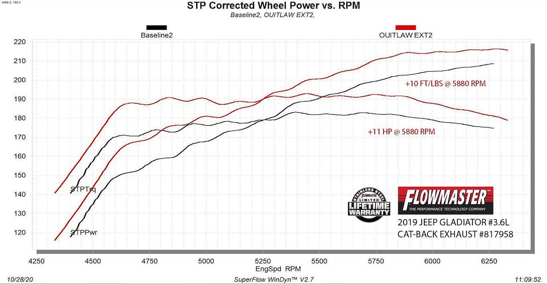 Flowmaster introduces our new Outlaw Extreme stainless steel cat-back exhaust system for the 2020-2021 Jeep Gladiator with the 3.6L engine. This system uses an Outlaw series muffler for a deep powerful sound and increased performance. 3.0-Inch Mandrel bent 409 stainless steel tubing is used for maximum exhaust flow and durability. The system has a turndown style dump exit right after the muffler to eliminate the over-axle tailpipe. This elimination of the tailpipe helps to improve ground clearance and departure angle when you are driving in more extreme off-road situations. All of the necessary hardware is included and factory mounting locations are used for an easy installation.