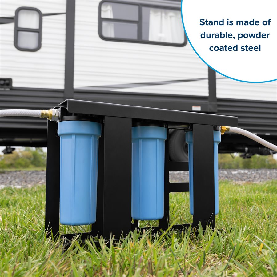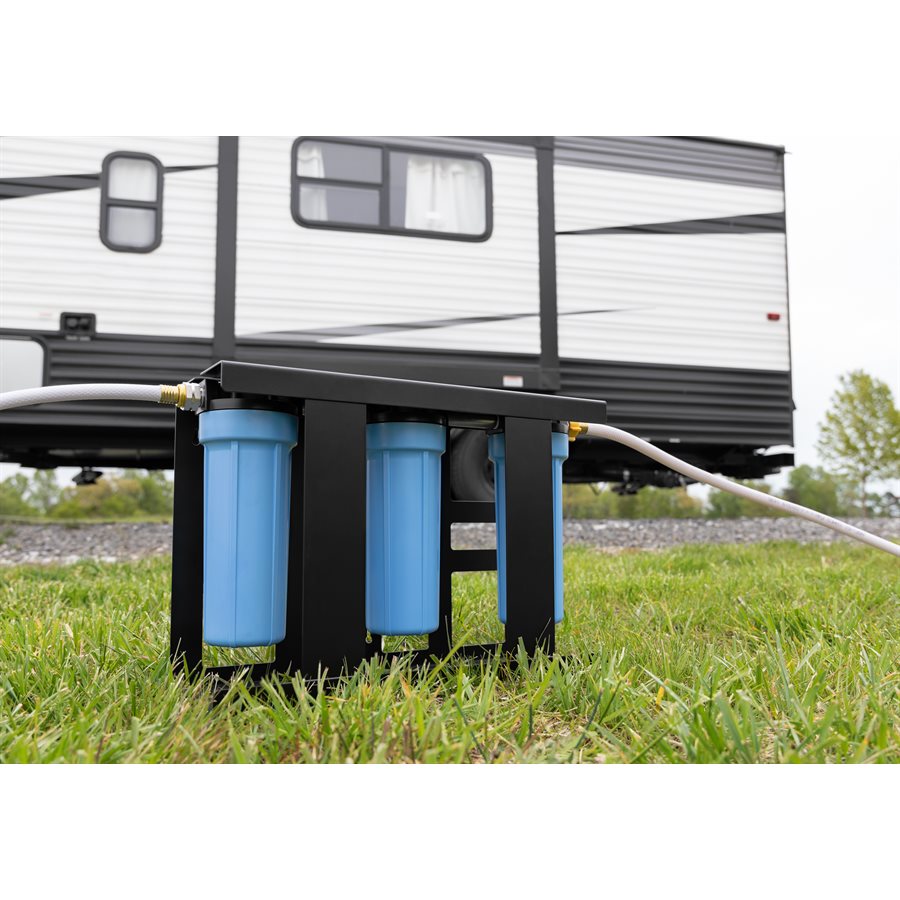 Camco’s Evo X3 Triple Stage Premium RV Water Filter Kit offers superior RV water filtration. It is rated at 0.2-microns to filter and minimize even more contaminates, including: viruses, bacteria, chlorine, bad taste, odors, sediment, and other contaminants from your fresh water supply. The result is fresh, clean, great-tasting water straight from your tap. It is capable of providing high flow throughout your RV—even allowing uncompromised water flow in your shower. With triple stage filtration, the first stage acts as a pre-filter, extending the life of the next two cartridges. It is comprised of a 5-micron sediment cartridge that contains KDF and GAC to remove heavy sediments, chlorine, bad tastes and odors. The second stage filter contains a 0-1/2-micron carbon block cartridge that offers protection against lead, volatile organic compounds (VOCs), chloramines, giardia, and other contaminates. The third stage filter contains a 0.2-micron electropositive pleated cartridge that helps remove viruses, bacteria and cysts from your water. The Evo X3’s heavy-duty, powder-coated metal chassis provides a sturdy base between your water source and your RV’s fresh water connection. This RV water filter kit features: (3) filter canisters, (1) built-in stand with rubber feet, (1) 4 Foot fresh water hose, (1) canister wrench, (1) replaceable premium spun polypropylene 5-micron sediment KDF/GAC cartridge, (1) replaceable premium 0-1/2-micron carbon block cartridge, and (1) replaceable premium 0.2-micron virus protection cartridge. Features nickel-plated brass male fitting and swiveling female fitting for easy setup between your water source and your RV's fresh water connections. The stand is constructed out of powder-coated steel for durability. For exterior use ONLY—can be mounted or staked for additional security.