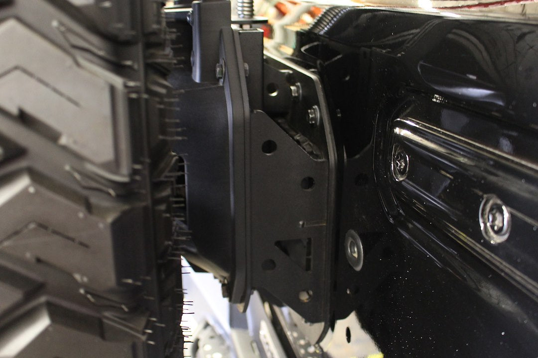 Rockline Spare Tire Relocation Kit, move the factory tire carrier out 3 Inch and up 2 Inch, works with up to 40 Inch tires. Provides additional mounting locations for alternate accessories like jack mounts, can mounts, basket mounts, and more.