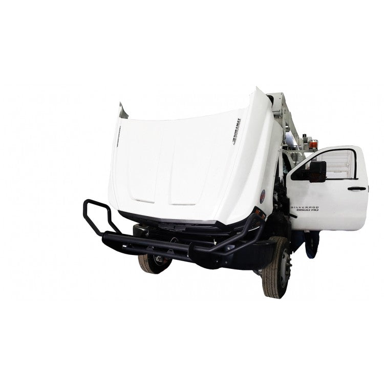 Go Industries Grille Guard features no cutting or drilling. Designed with the tilt body in mind, this piece will articulate forward for easy hood access. Our locking mechanism has two OEM style latches and safety pins ensuring a snug, secure mount. The grille guard is fully welded together with headlight Brush Guards constructed out of 1.9 Inch, 14 gauge tubing and 2.5 Inch center cross tubes. The center screen is laser cut out of 18 gauge material. Part comes in a Black textured powder coat finish. Proudly made in the U.S.A.