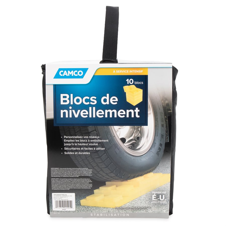 Heavy duty blocks are safe and easy to use. They offer many options for leveling single wheels, dual wheels, hydraulic jacks, tongue jacks, stabilizer jacks, 5th wheel jacks and tandem axles. Customize your levels: Stack interlocking blocks to desired height. Strong and durable blocks. Patent pending. Each set comes in a convenient storage bag.