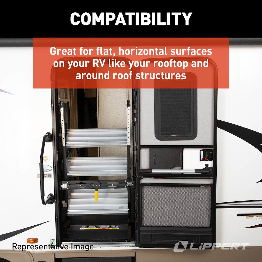 Lippert the Alpha lineup of adhesives, sealants, tapes and roofing kits are specifically formulated to work together as a holistic system for your RV. Our 1021, self-leveling lap sealant is a must-have when repairing flat surfaces like your RV's roof, and around roofing structures like antennas, vents, skylights and more. This RV self-leveling sealant is the perfect solution for rubber, metal or fiberglass RV roofs. Plus, once it’s fully cured, it can hold up against the shock, vibrations, and stress of outdoor transportation.