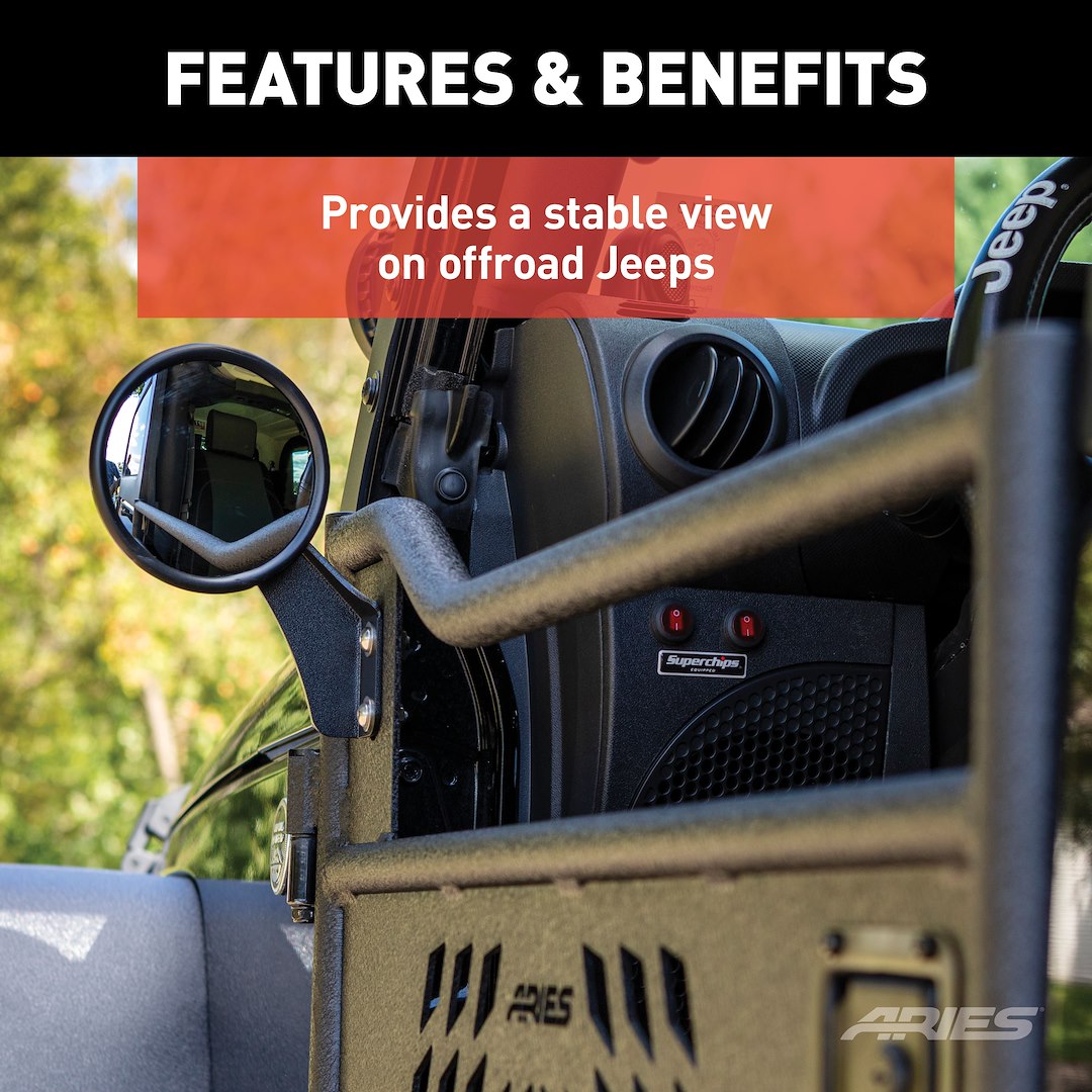 They are designed to quickly and securely mount onto ARIES Jeep tube doors and provide a rock-solid view. The high-strength steel construction is specially engineered to prevent rattling and vibration to give you a clear, steady side mirror view. This pair of steel Jeep half door mirrors are uniquely constructed for offroading. Vibrations are one of the biggest problems for Jeep door mirrors, and this pair combats every bump and vibration with a rock-solid steel construction. The brackets are 11-gauge steel, and the mounting plate is 16-gauge. A center-mount ball stud provides a rigid attachment point with the option to tilt and adjust the mirrors as needed.