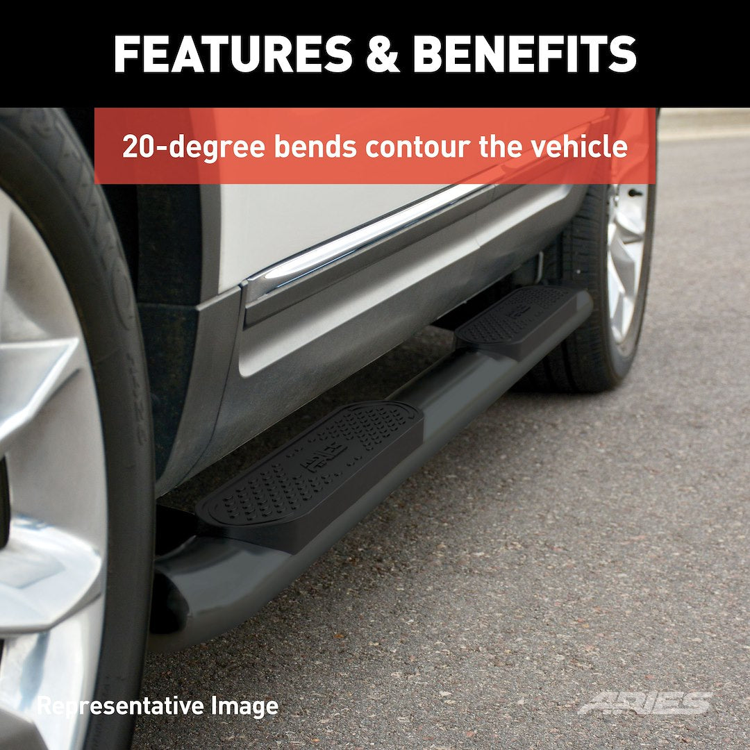 ARIES 4 Inch oval side bars are sleek, strong and custom-fitted to be a highly functional extension of your truck. They are made with strong 4 Inch elliptical tubing with unique blended end caps and 20-Degree bent ends to contour to body of the vehicle. The steps pads are raised and feature a non-skid surface to provide safe, comfortable entry and exit.