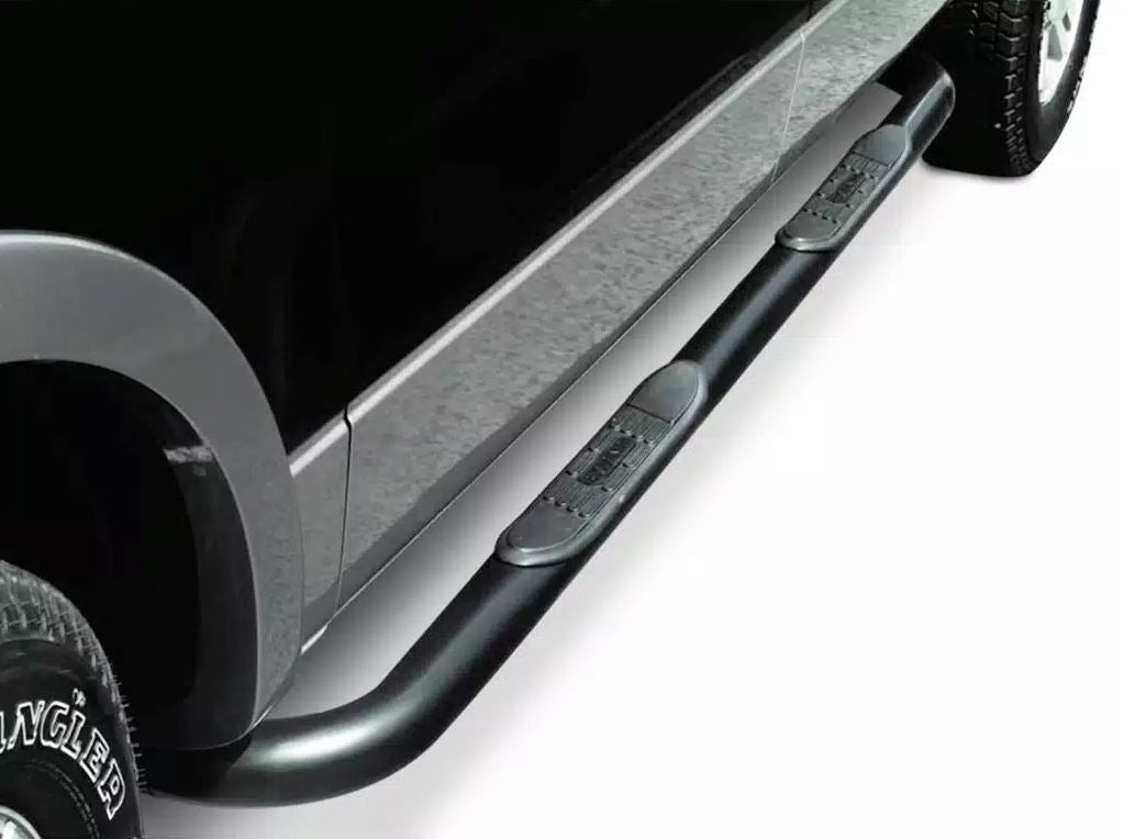 3 Inch Round classic side bars. Custom fit for an extensive list of applications. No drilling required. Manufactured of 3 Inch diameter tubing for cab length applications. Non-slip, black composite step pads. Installation hardware, brackets and instructions provided.