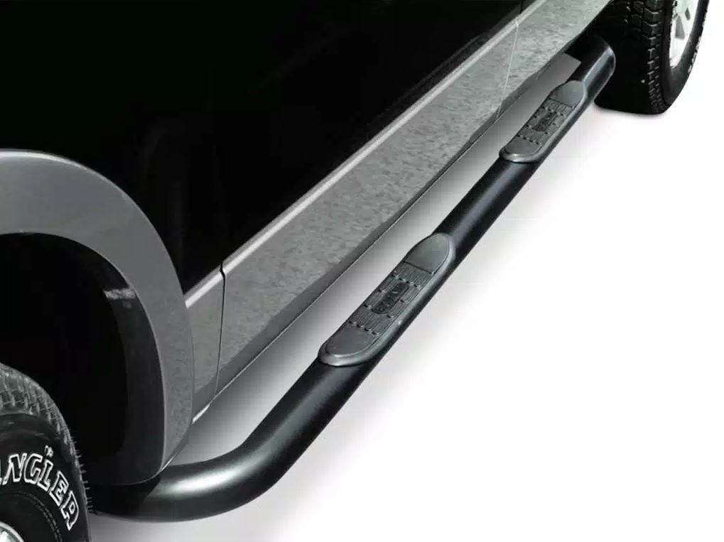3 Inch Round classic side bars. Custom fit for an extensive list of applications. No drilling required. Manufactured of 3 Inch diameter tubing for cab length applications. Non-slip, black composite step pads. Installation hardware, brackets and instructions provided.