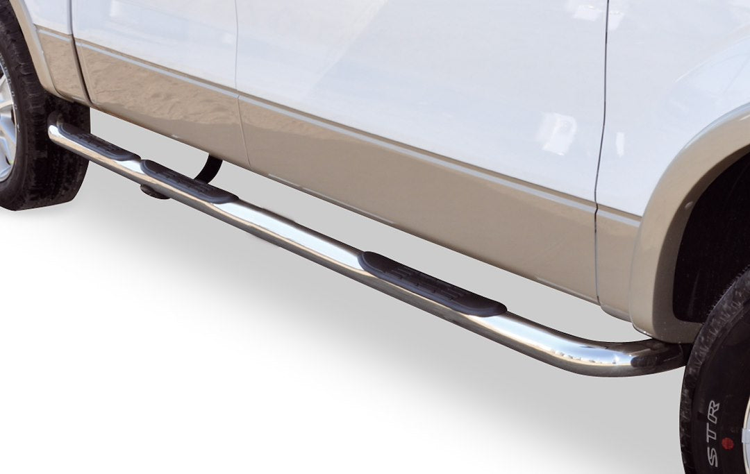 3 Inch Stainless Round Wheel to Wheel Side Steps. Extra length and step for easy access to bed or tool box. Easy bolt-on, no-drill installation. Non-skid step pads at each door for safe entry and exit. Installation hardware, brackets and instructions provided. Extended Cab and Crew Cab, short and long bed applications. Constructed of rugged 3 Inch round stainless steel tubing for maximum strength.