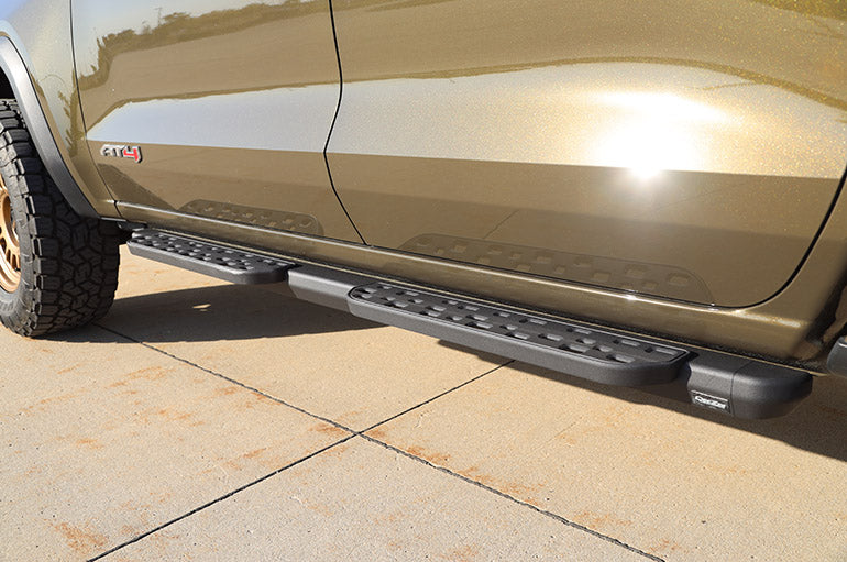 A rugged reimagining of a classic design, the Apex Side Steps feature a frame constructed from durable extruded aluminum, finished with a textured black powder coat for enhanced protection. The cast aluminum step pads provide a generous stepping area at each door, ensuring excellent traction while allowing debris to easily fall through the grated design.