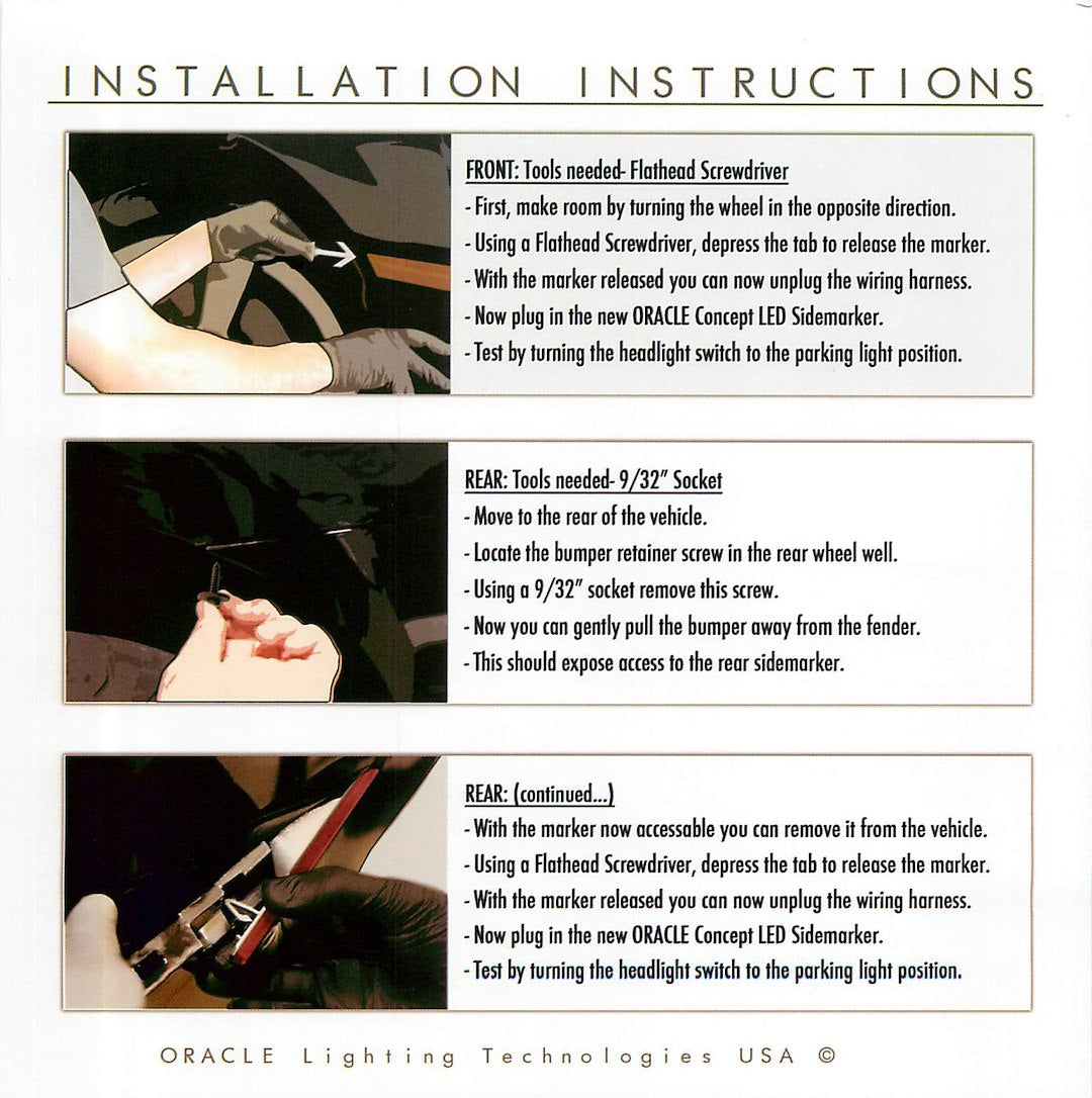 Concept SMD Side marker lights are complete side marker replacements fitted with high powered Bridgelux LEDs that produce a laser-like appearance. These with Clear or Tinted lenses and painted to match any of the factory paint codes. ORACLE Lighting is proud to offer the brightest side markers on the market to our customers. Do not be fooled by too good to be true prices ORACLE Lighting originated LED Side markers, imitators don't measure up to our quality.