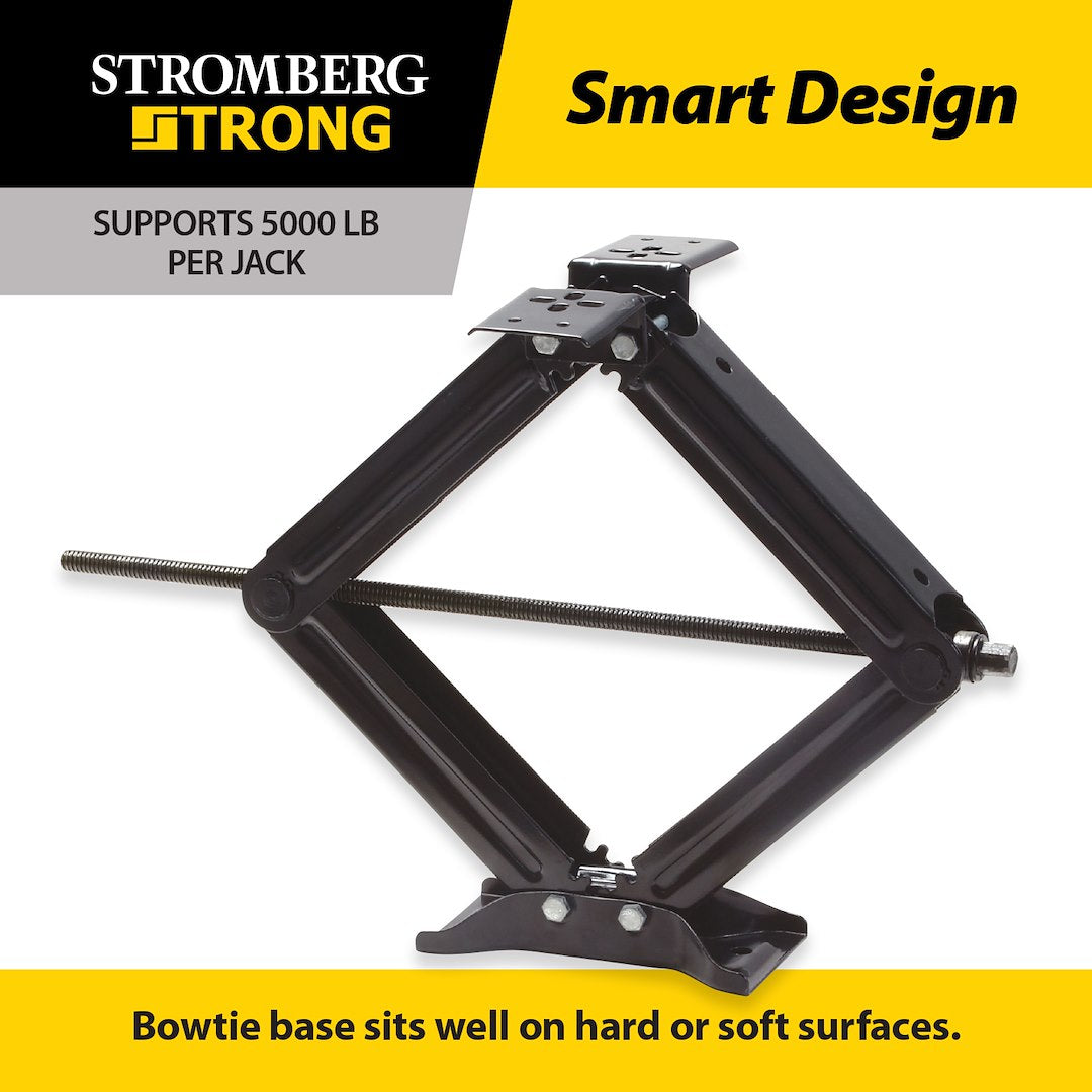 Stromberg Carlson scissor jacks are the industry’s choice to stabilize and level your travel trailer and or fifth wheel. Our jacks can lift and level 5000 Pound each and our base will support your unit on hard or soft surfaces. Jacks can be purchased individually or as a pair.