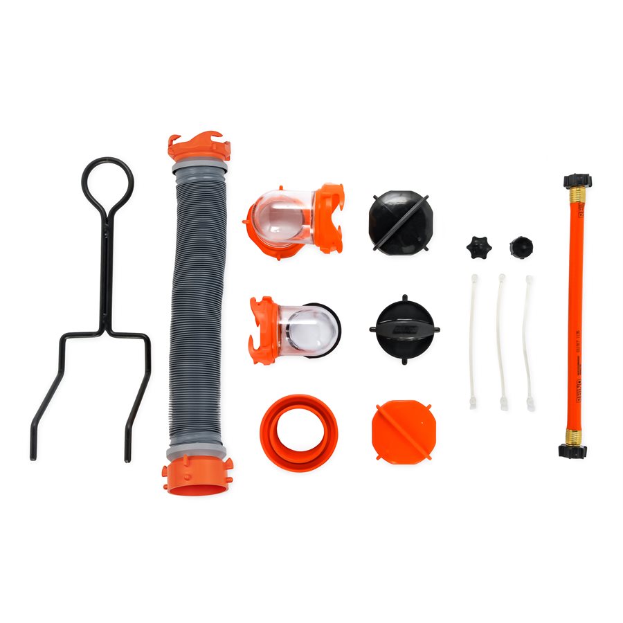 Ready-to-use kit equipped with everything needed to transport waste from your RV or trailer to a dump station when you’re parked too far away for a sewer hose; plus accessories to clean, maintain and store the tote tank when not in use. Large, heavy-duty, no-flat wheels with bearings make transport smooth and easy and removable steel tow adapter allows you to easily roll the tote tank like a suitcase, or tow it slowly behind a golf cart or truck. Integrated ladder hook hangs on RV ladder when not in use and the body of the tote tank features grooves to securely strap it in place.