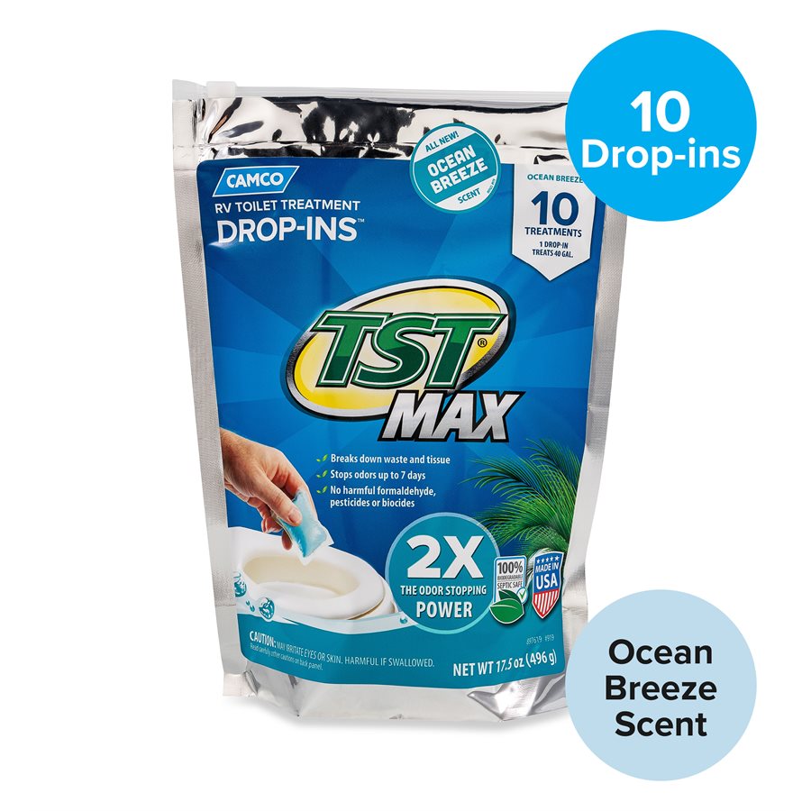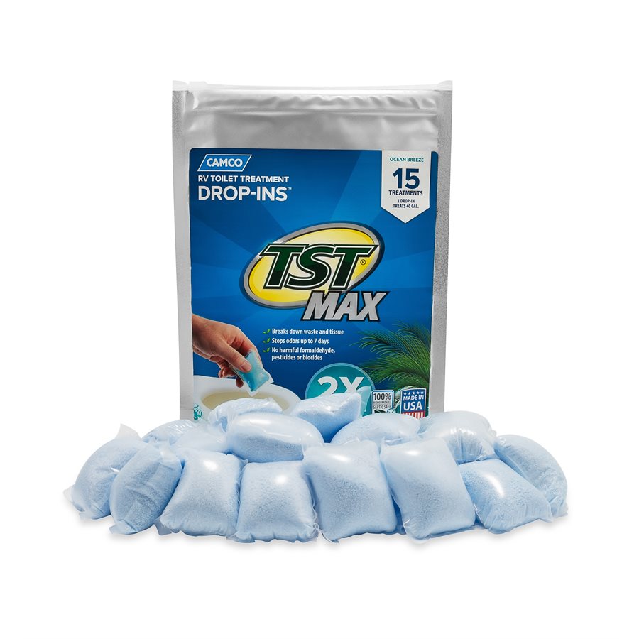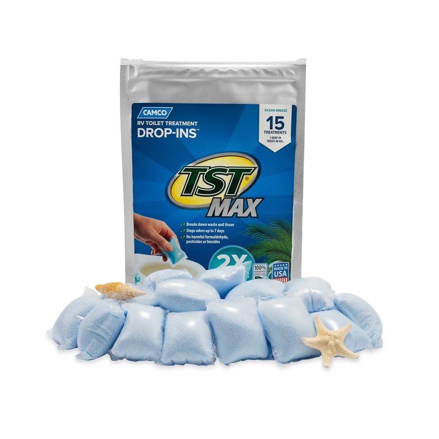 The TST MAX Drop-Ins help control unwanted odors and break down waste and tissue in your black water holding tank. The easy to use drop-ins contain a special chemical that helps break down waste. They also have a blend of ocean-scented surfactant oils that trap unwanted odors in your tank, making your camping experience more enjoyable. The drop-ins are RV and marine approved, non-formaldehyde and safe for all septic tanks—they’re even great for portable camping toilets.