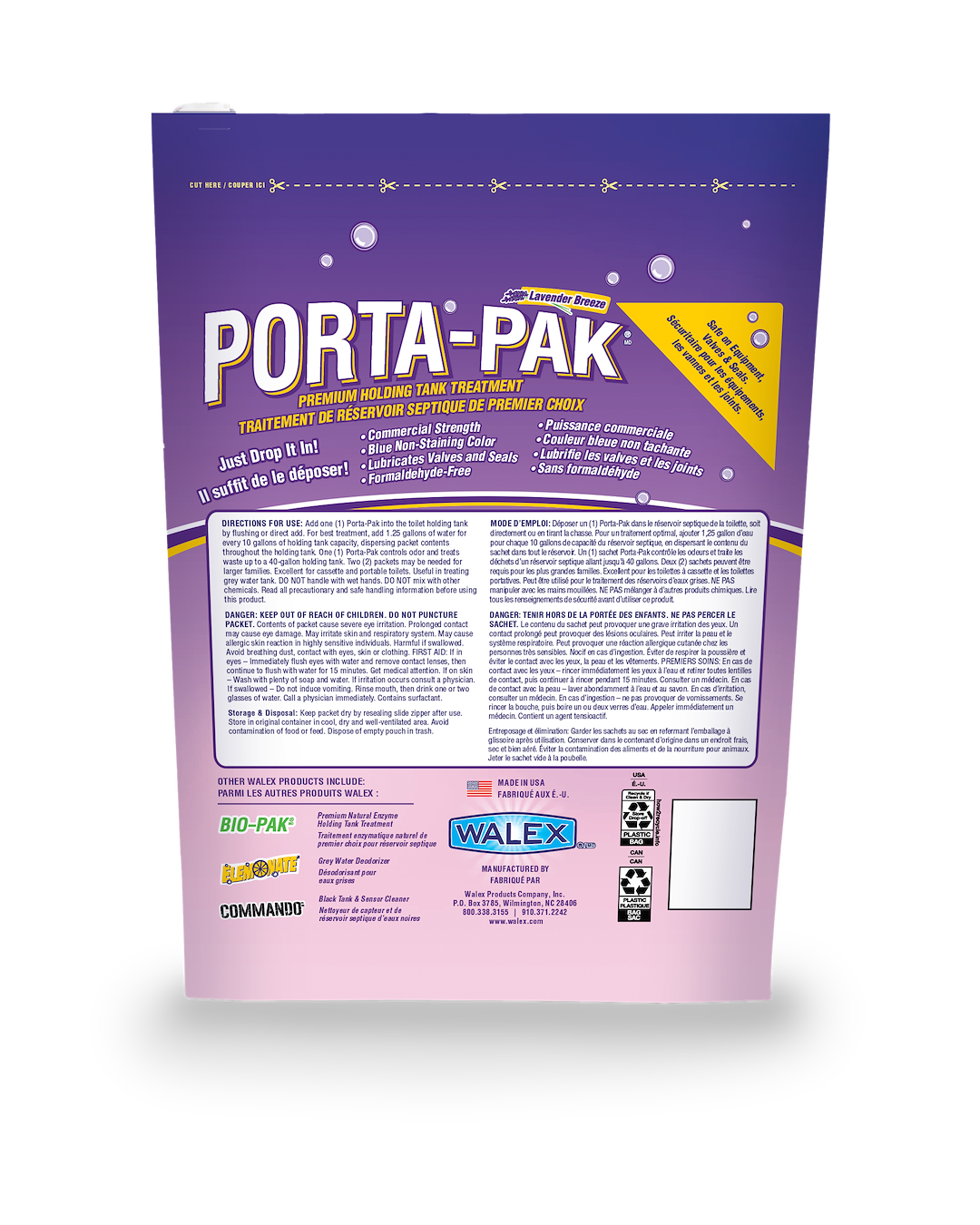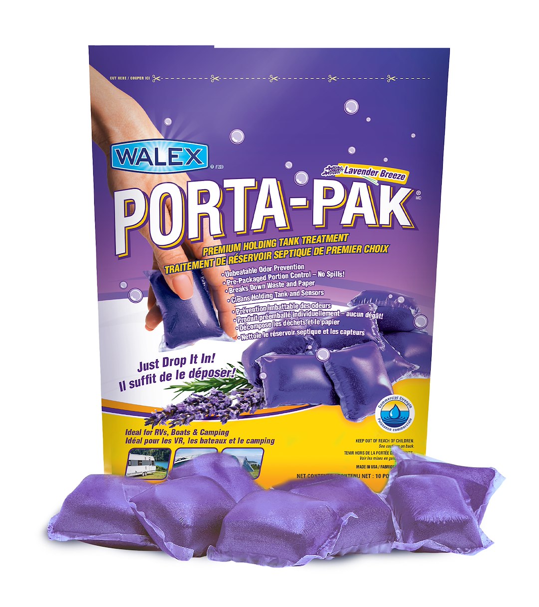 Never deal with a messy liquid again. Just drop Porta-Pak in your toilet and the pre-packaged portion controls odor, breaks down waste and paper, lubricates valves and cleans sensors. Travel with a familiar scent from home. New Porta-Pak Lavender Breeze offers a fresh new scent for the industry's No.1 sold portion control holding tank product. All the same benefits you're accustomed to in a fresh new scent and color.