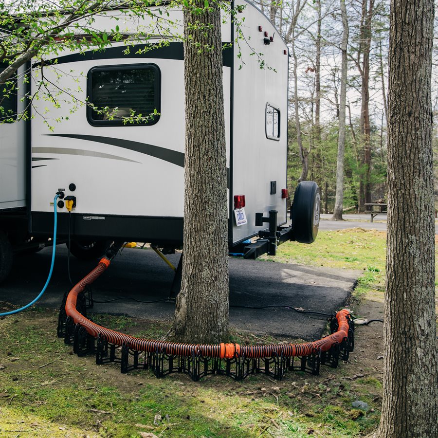 Sidewinder™ Sewer Hose Supports were designed to go around any obstacle and allow proper drainage. Sturdy, lightweight plastic support with strong snap-fit hinges has deep cradles to hold sewer hose in place without straps. No staples to rust. Easily positions around obstacles and stays where you put it. Won’t creep closed.