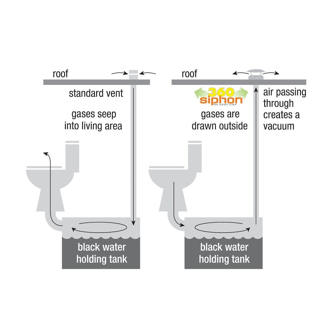 The 360 Siphon ® RV holding tank vent cap remove odors from the source the holding tanks and exhausts them out the roof vent before they have a chance to invade the RV living space. By design, the patented 360 Siphon can only create an updraft, expelling odors and fostering an oxygen-rich environment to speed up waste breakdown. Even environmentally-friendly tank additives can take up to 48 Hours after use to fully oxygenate a standard holding tank. The 360 Siphon acts immediately after installation in any wind condition (with or without a breeze) to provide the ideal environment for proper decomposition, so caustic chemicals and perfumed cover-ups are no longer needed.